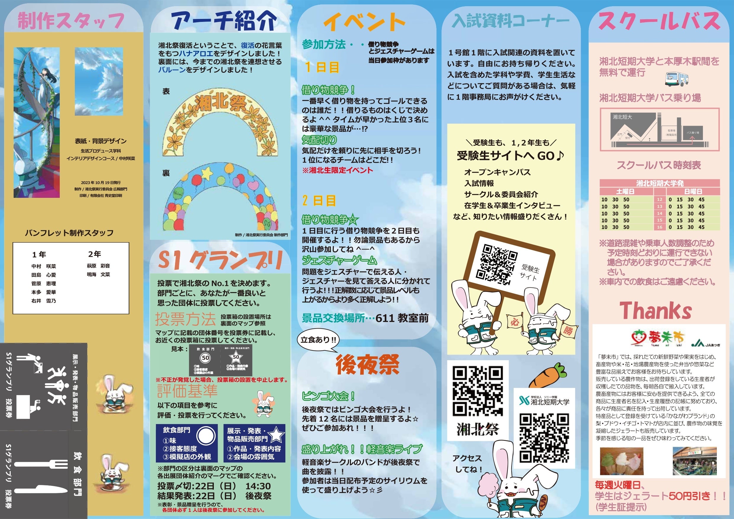 今年の湘北祭は4年ぶりに入場制限のない対面方式で開催します(2020年~2022年はオンラインのみで配信)。湘北祭実行委員会のメンバー約80名が運営管理、イベント、広報、制作、出展管理の各部門に分かれ、各団体・ゼミが行うイベントやパフォーマンス、模擬店などの調整や準備を6月から進めてきました。前回の対面開催を経験した学生が卒業しているため、委員会メンバーは過去の映像や写真、資料を頼りに手探り・試行錯誤を重ねて準備に取り組みました。戸惑いながらも一歩ずつ着実に対面開催の実現に向けて準備を進めてきた湘北祭は、学生それぞれの情熱や想いが溢れる手作り感満載のイベントです。