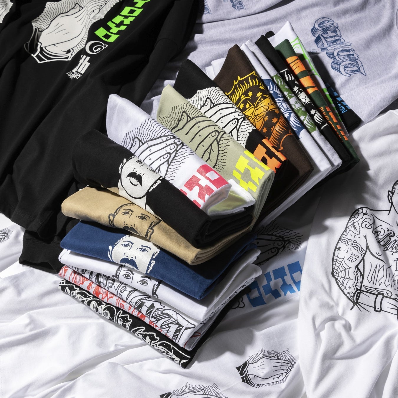 フロント/背面にMike Giant(マイクジャイアント)のグラフィックをプリントし、特殊なプリント技法を採用した凝った仕様になっています。ホワイト、ブラックの定番色を中心にサワーグリーン、ブラウン、ネイビー、グレーなど、この夏を色鮮やかに彩る様々なカラーで展開いたします。