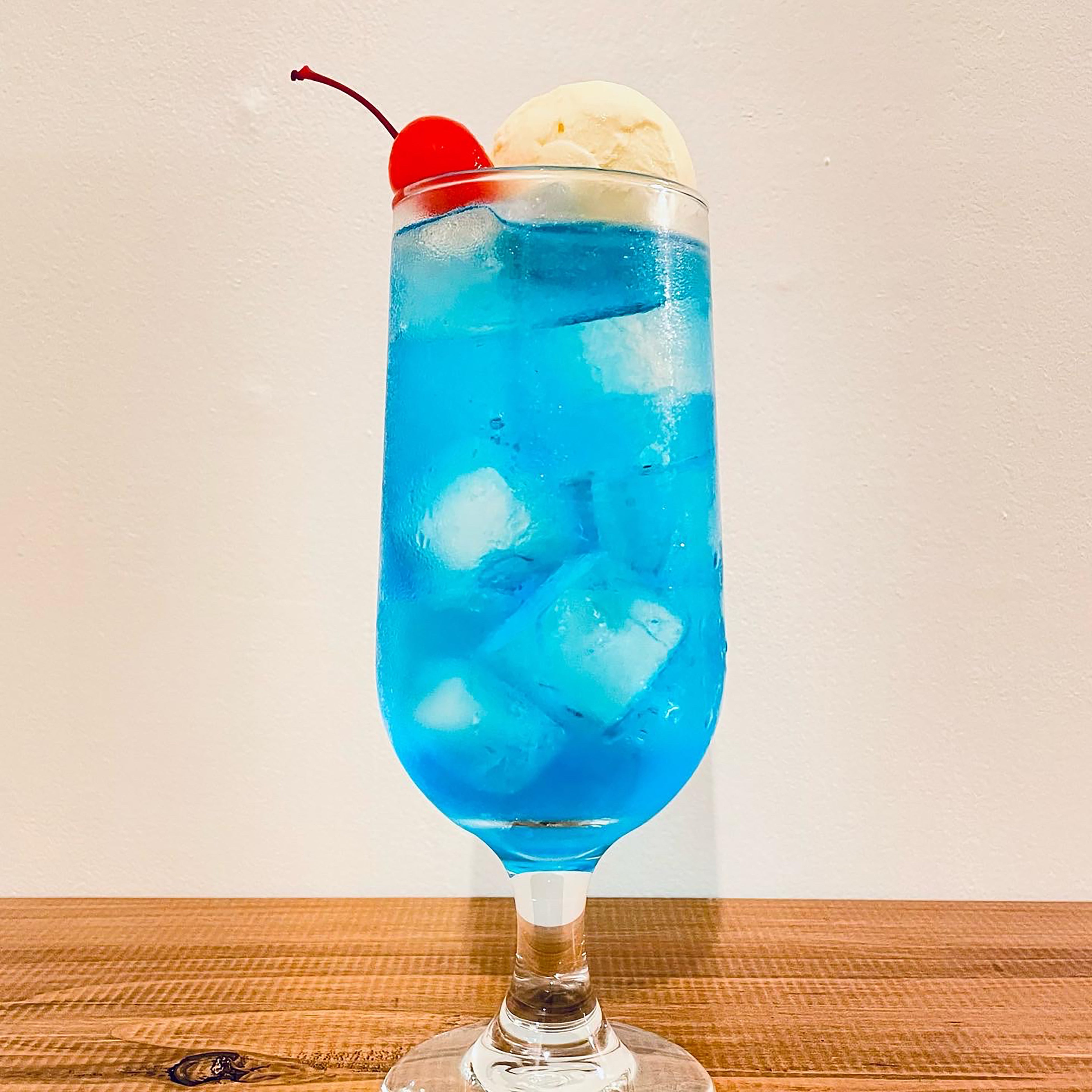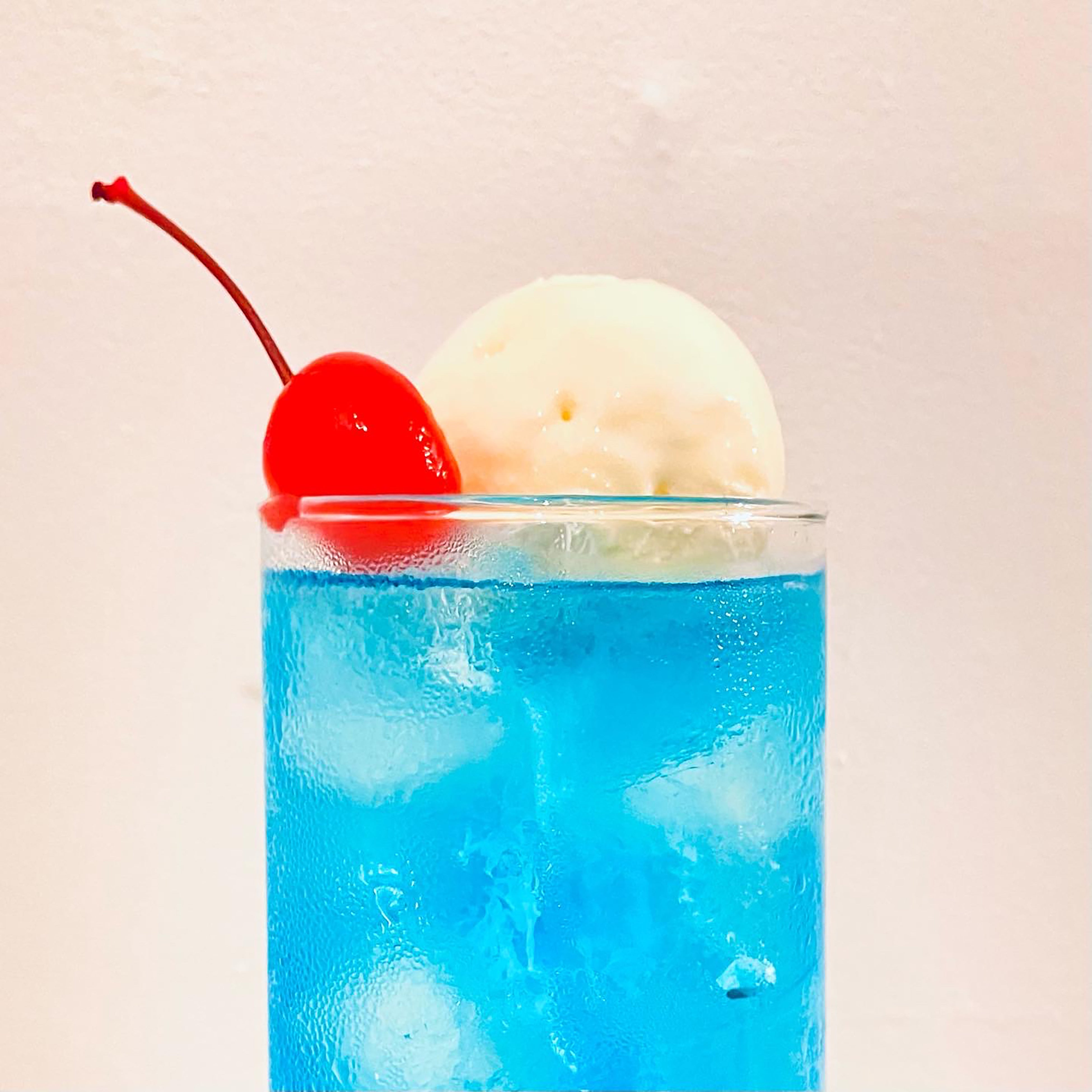 透き通る空色ブルーにバニラアイス、赤いチェリーがワンポイントのシンプルでどこか懐かしいクリームソーダ。