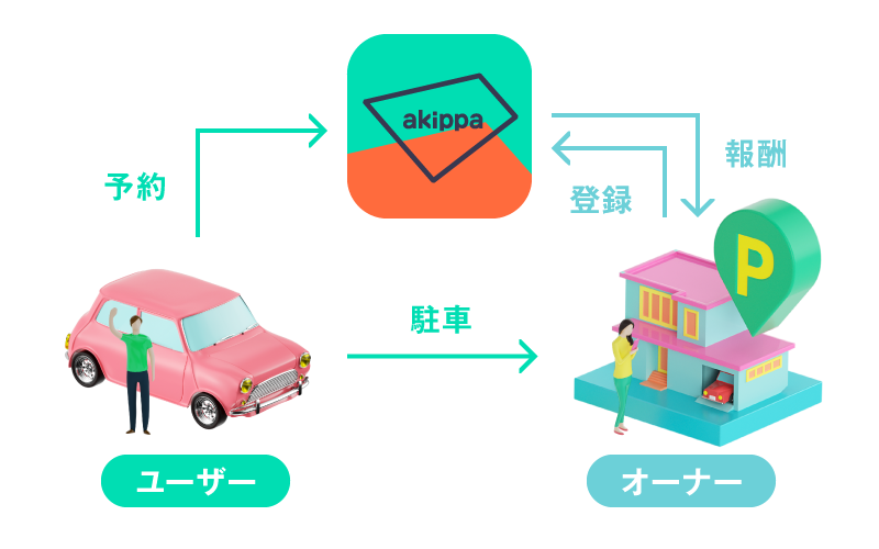 週末に利用されていない企業のビル・倉庫の駐車場、月極駐車場の未契約のスペース、個人宅の車庫・空き地、商業施設などの空きスペースがあれば、駐車場オーナーは15分単位でネット予約して簡単に貸出できます。ドライバーは、Webやスマホアプリから予約・事前決済して利用できるサービスです。駐車スペースの貸出、会員登録は無料、駐車場オーナーは利用料に応じて報酬を受け取ることができます。全国に常時35,000件以上予約できる駐車場を確保しており、現会員数は累計350万人(2023年10月時点、貸主は含まない)です。