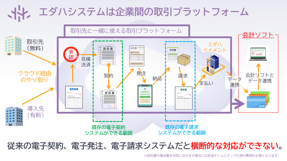 企業間取引における見積もり、発注、納品、請求、決済履行を一元管理するシステムです。見積もりから決済履行まで横断的に利用することができ、社内での利用だけでなく、取引先とも共同で利用できることから、取引先をも巻き込んだDX化ができるツールとして注目されています。電子帳簿保存法やインボイス制度に対応しており、商品・サービスの検収時に請求決済できる「履行決済」は特許も取得しています。
