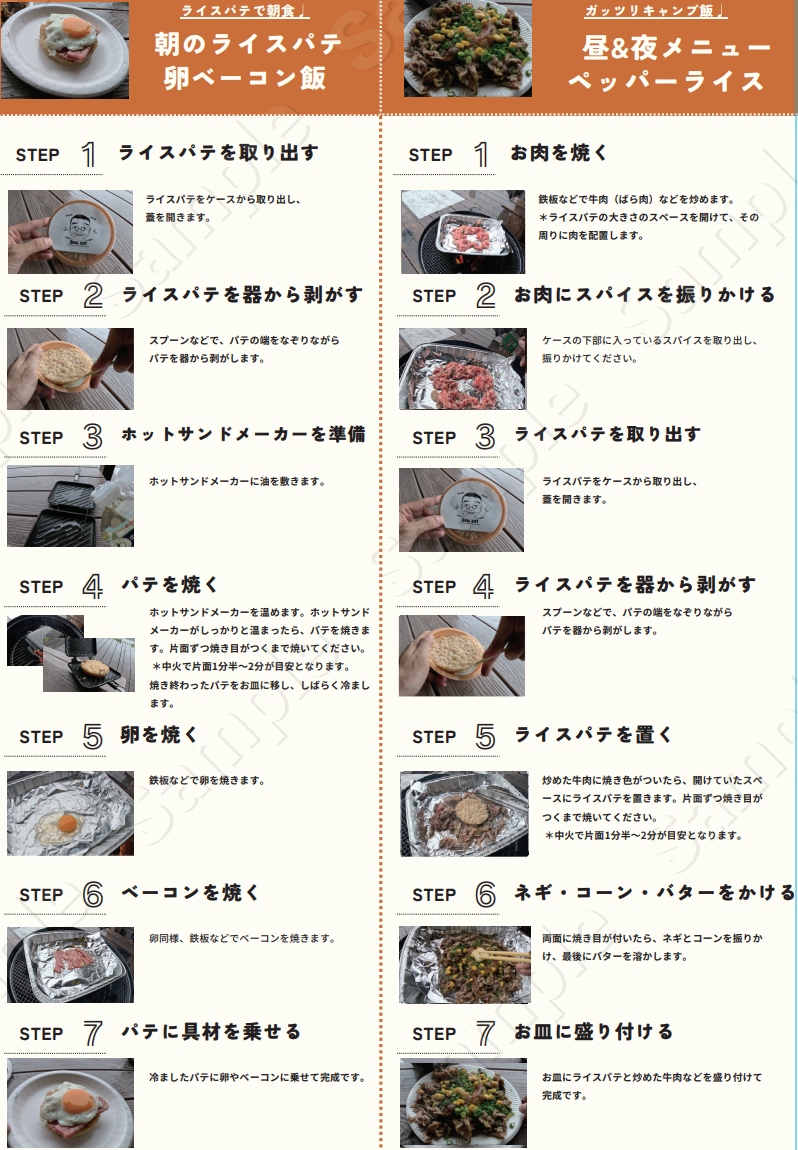洗米不要で、焼くだけで食べられる個包装のライスパテにすることで、様々なキャンプ飯のおかずと合わせた楽しみ方が可能となります。