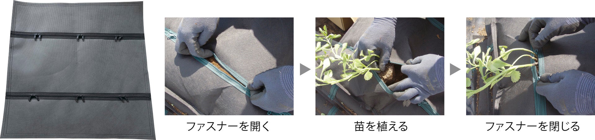 施工も土が入った袋のファスナーを開け、常緑キリンソウ®の苗を植えて閉じるだけの手軽さを実現しています。