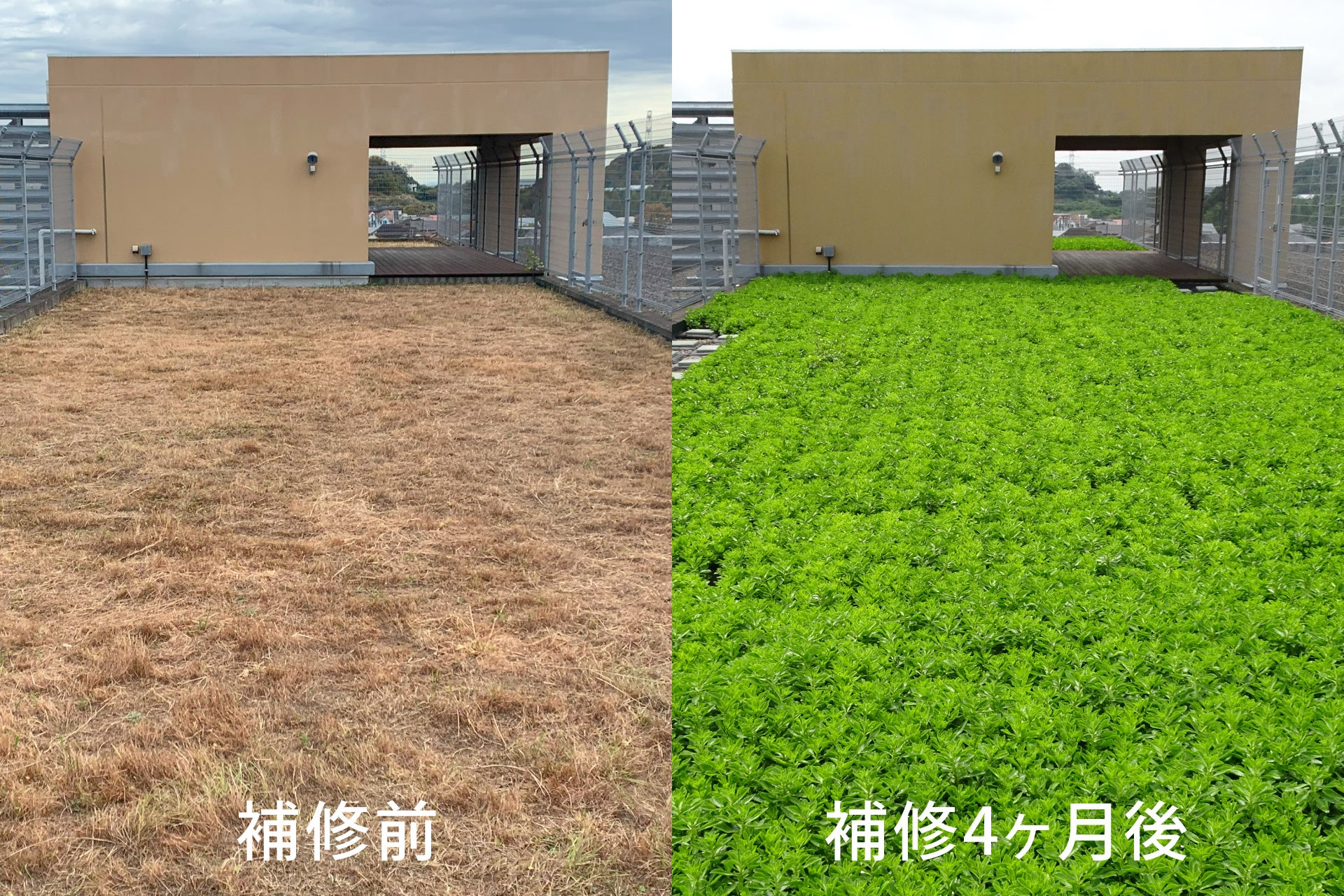 そこで緑化計画研究所が取り扱う「常緑キリンソウ袋方式®」に白羽の矢が立ち、2023年2月より補修施工を行いました。その後、順調に屋上緑化が青々と成長したことから、追加での補修施工を8月より実施。「常緑キリンソウ袋方式®」開発元の株式会社フジタ(本社:鳥取県岩美郡岩美町、代表:藤田 豊博)様にもご協力をいただき、無事に屋上緑化施工を完了し、この酷暑を乗り切っています。