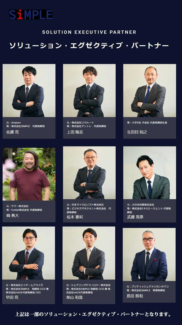 SIMPLEのソリューション・エクゼクティブ・パートナー(コンサルタント)は多様な専門知識と経験を持つ現役のプロフェッショナルで構成されており、人的資本、DXを推進しAI等の最先端のテクノロジーやツール、分析手法を駆使して『高い品質、信頼性、誠実さ、革新性』に基づき成功を支援し、業界のトレンドや市場環境の変化に適応しながら、クライアント様にとって、最適な戦略を策定する唯一無二のパートナーになることです。