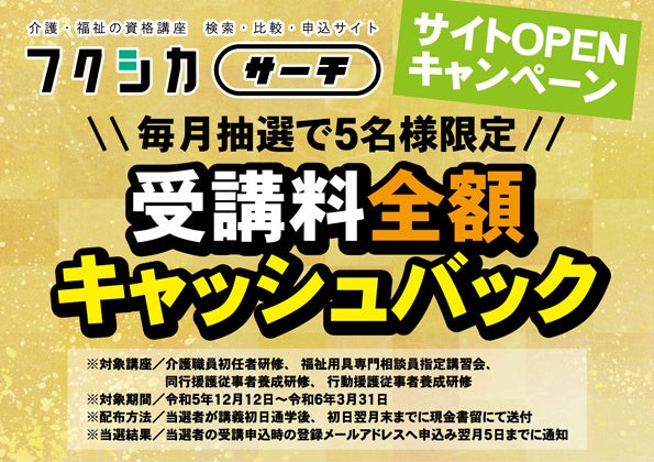 ◯内容/フクシカサーチから対象資格講座に申し込んだ方の中から、毎月抽選で5名様に資格取得受講料を全額キャッシュバック。