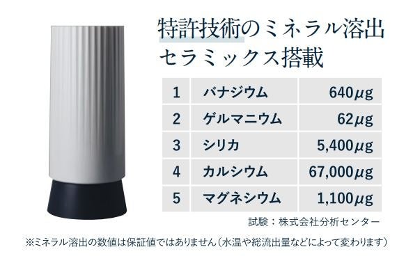 LAPUR(ラピュール)WP-3000の開発コンセプトは、ずばり「現代人のミネラル不足解消を、普段使いの水道水で補う」ことです。思考錯誤を繰り返し、高水準で浄化したお水に、バナジム・ゲルマニウム・シリカ・カルシウム・マグネシウムといったミネラルを溶出させた技術を開発しました。