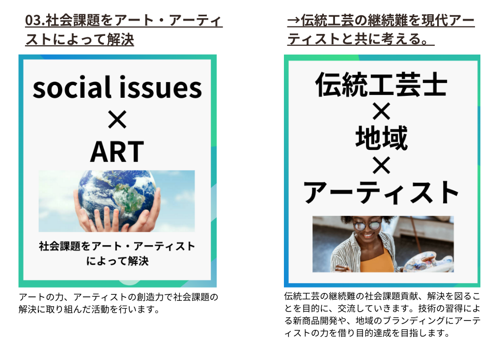 アートとは一概に曖昧ですが、社会では一歩先の具体的な創造性のアートが求められています。アーティストから引き出し、アーティストと共にNew creativeなイノベーションを創り出していきます。気づいたらアートに触れていた、日常がなんだか豊かになっていた、笑顔になっていた、そんなアートで彩られる世界の実現に挑みます。