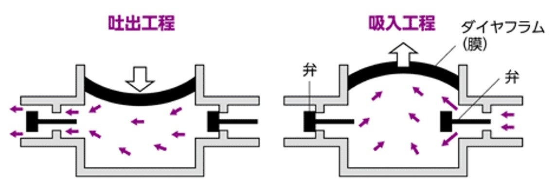 ダイヤフラムと呼ばれる膜を往復動させることで流体を移送させるポンプです。ダイヤフラム(膜)と2つの弁で構成されています。