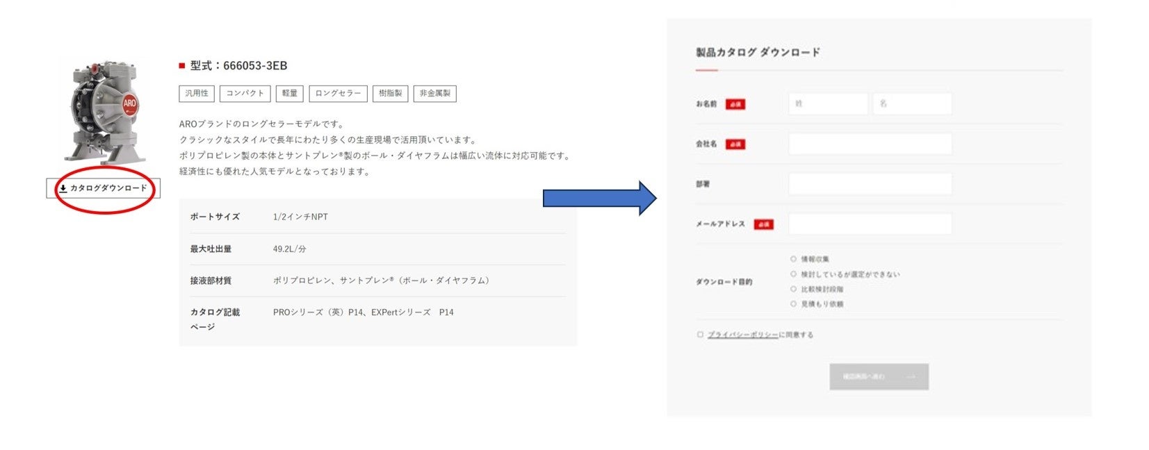 「ダイヤフラムポンプ」「ピストンポンプ」など主力商品のカタログのダウロードや問い合わせがよりスムーズに