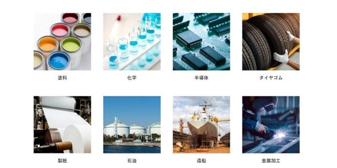 これまでに塗料・科学・半導体・タイヤゴム・製紙・石油・造船業・金属加工など幅広い分野で導入いただいております。