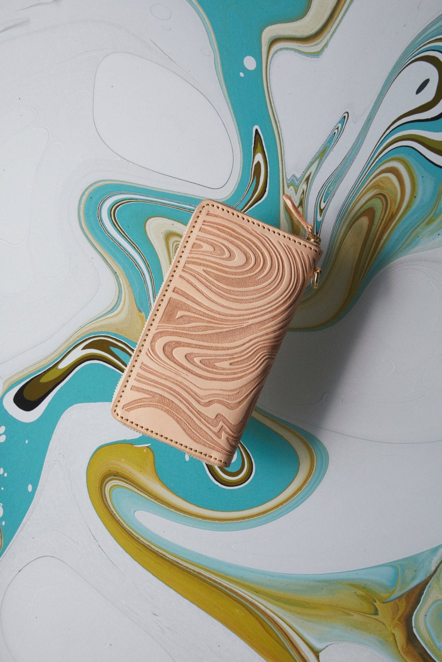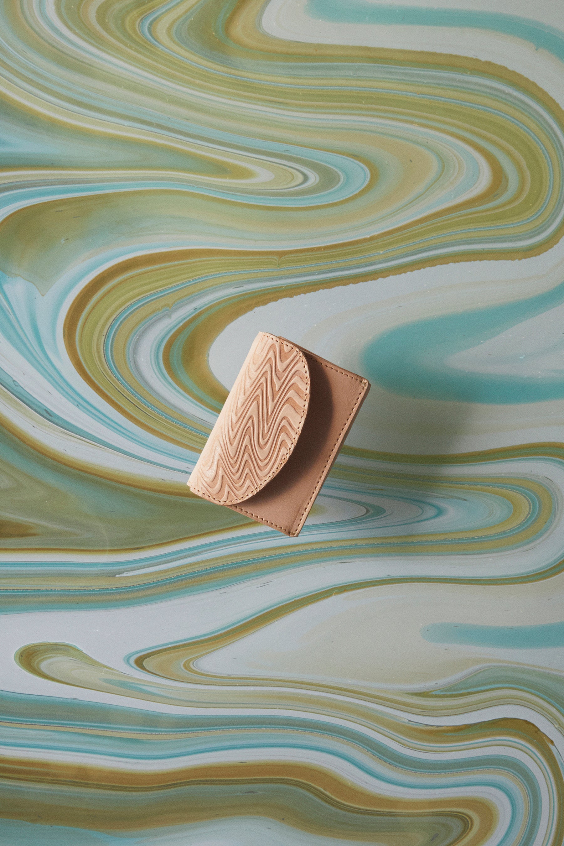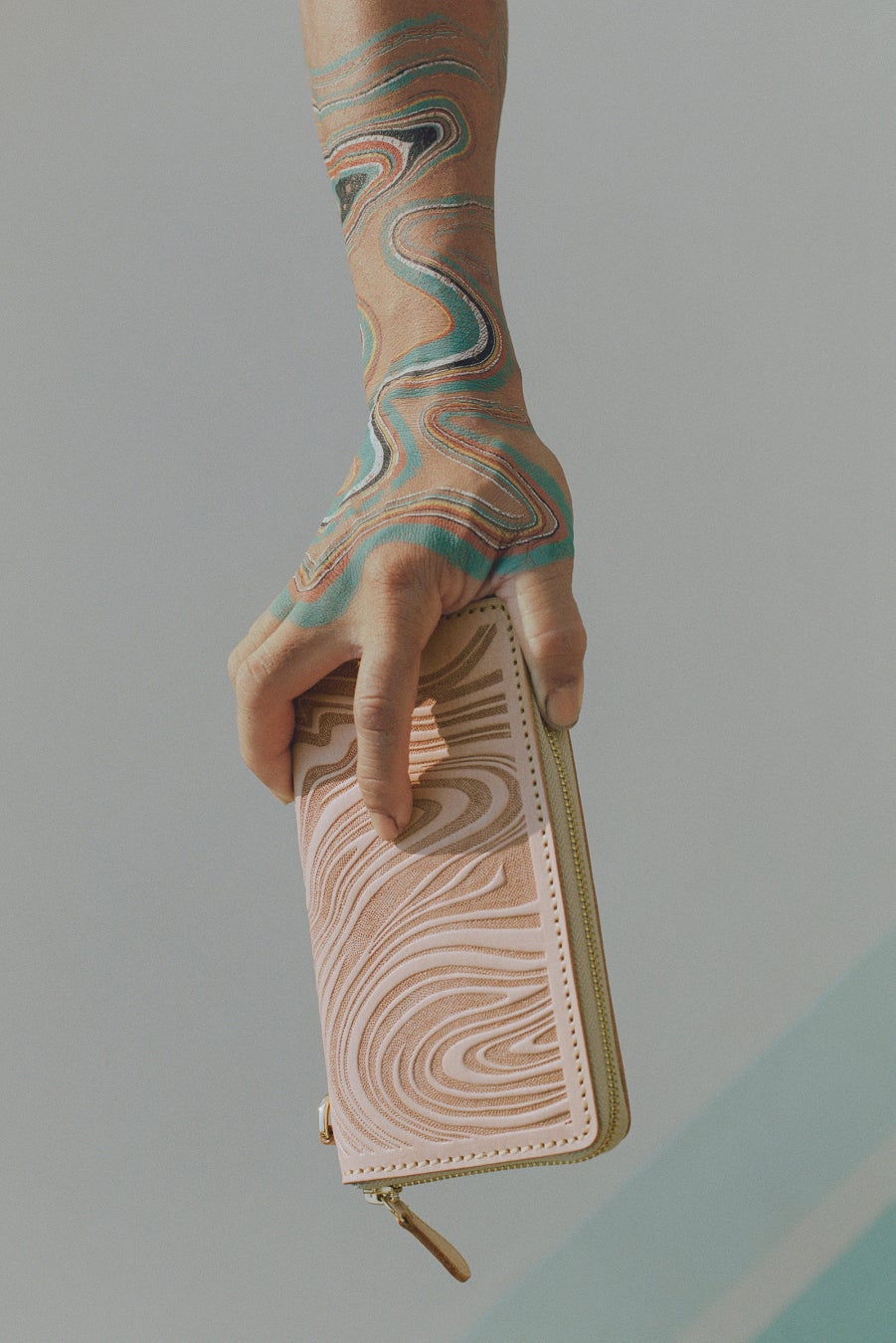 今回のコラボレーションでは、DWSが描いた「色流し」のデザインをバンコクレザー工場の職人たちと共に製作。互いの”手”にこだわり、伝統と革新を織りまぜた新たな作品へと仕上がりました。