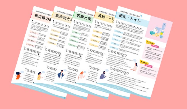衛生・トイレ/連絡・コミュニケーション/医療と薬/飲み物と食料/被災時の環境にわけ、様々な障害により発生する不安や問題と、解決例を掲載。「自分や家族だったらどうしよう?」を考えるきっかけになるように構成しています。