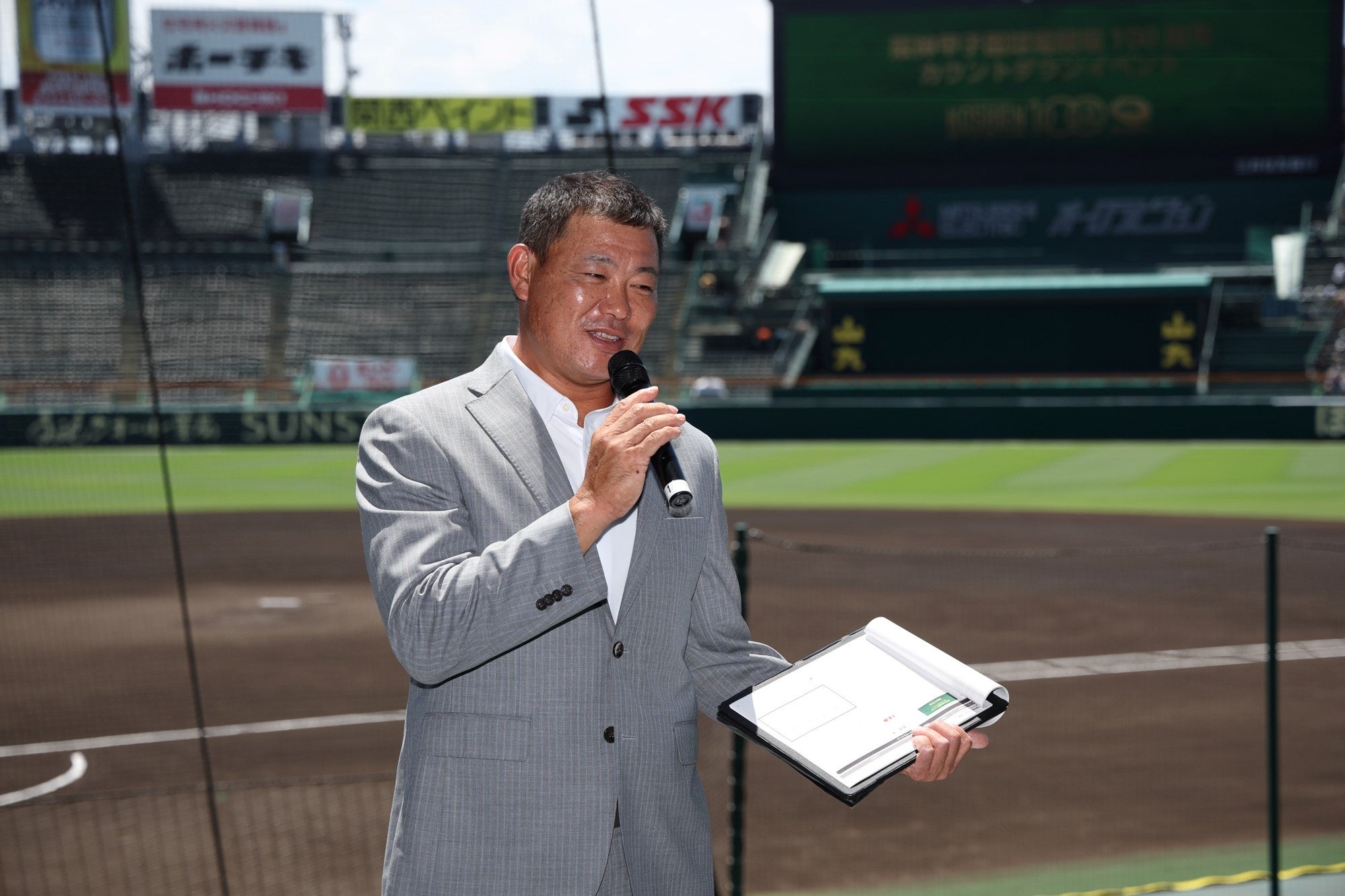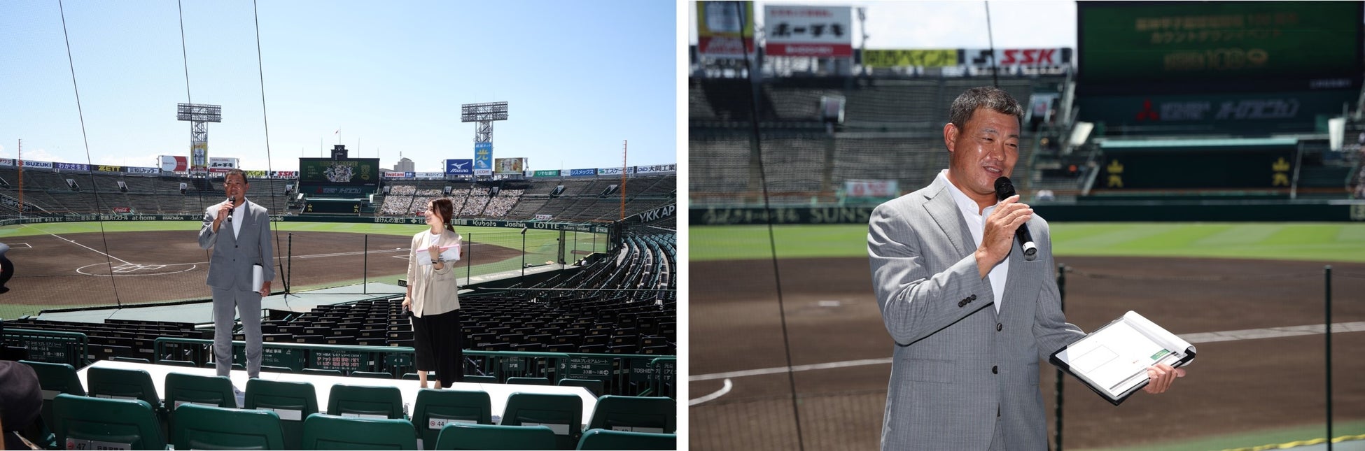 阪神電気鉄道株式会社の赤楚球場長代理から、100周年プロジェクトの概要説明とともに、「今後とも阪神甲子園球場100周年記念事業にご期待ください。」と結びました。その後、福留さんと赤楚球場長代理でカウントダウンボードの除幕式を行い、お披露目されたメモリアルなボードに会場は拍手に包まれました。除幕式後に福留さんからは「世界一の球場になってほしいと願うのはもちろん、芸術やエンタメなど色々な分野で輝ける場所になってほしい」とこれからの阪神甲子園球場にかける期待をコメントいただきました。