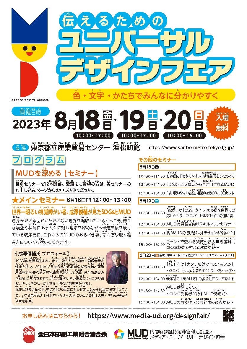 本イベントは「MUDを見る・触れる・深める・感じる」をコンセプトに、【MUDを見る・触れる(展示コーナー)】では、MUDの事例紹介やMUD認証企業の取り組み、大学等の学術研究や関連団体の展示、行政及び地方自治体の取り組み、企業や学生が製作したMUDに配慮した作品のコンペティション(経済産業省後援)の受賞作品などを展示します。また、【MUDを深める(セミナー)】は一般や学生、MUD検定の有資格者など対象ごとにSDGsの視点から見たMUDなど12本のセミナーを企画、【MUDを感じる(体験コーナー)】では「ユニバーサル・デザインかるた」や「新しい点字の名刺作成体験」など、小学校の夏休みの自由研究テーマに役立つコーナーも用意しています。来場者は、業界関係者、一般、学生など3日間で5000人の来場を見込んでおり、大人から子どもまで「伝えるためのユニバーサルデザイン」を学んで体験できるイベントとなっておりますので、お気軽にご参加ください。