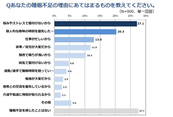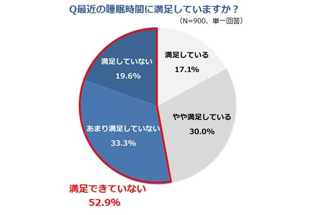 また、最近の睡眠時間に満足しているかという設問には、「満足していない」が19.6%、「あまり満足していない」が33.3%で約半数の52.9%の人が最近の平均睡眠時間に満足できていないと回答。また睡眠不足の理由の1位が「悩みやストレスで寝付けない」で27.1%、2位が「個人的な趣味の時間を優先したい」で20.3%、3位が「仕事が忙しい」13.0%という結果になりました。