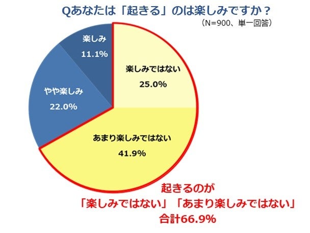 寝るのが楽しみかを聞くと、約7割が「楽しみ」と回答。その内約8割の人が「寝ること自体が好き」と回答しました。一方、起きるのが楽しみかを聞くと、約7割が「楽しみでない」という逆の結果となりました。寝ることへ楽しみな思いが強い反面、眠りが覚め、起きることへの楽しみがないことがわかりました。