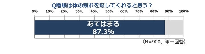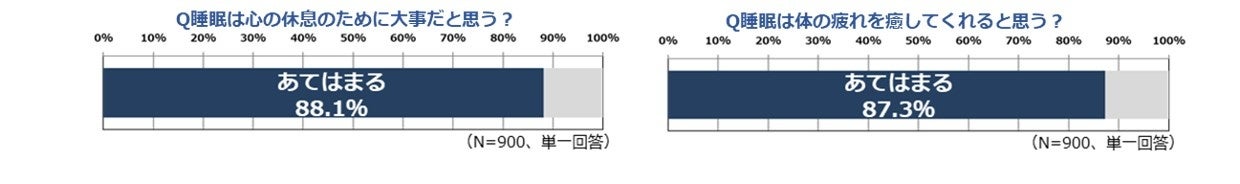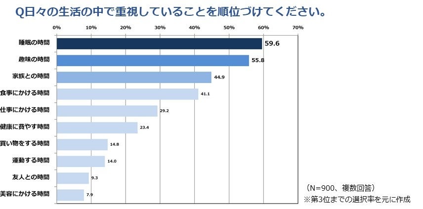 日々の生活の中で重要視していることを聞くと、1位が「睡眠の時間」で59.6%、2位が「趣味の時間」で55.8%、3位が「家族との時間」44.9%という結果になりました。さらに、約9割の人が睡眠は心身を癒すためにも大事なことだと考えていることがわかりました。
