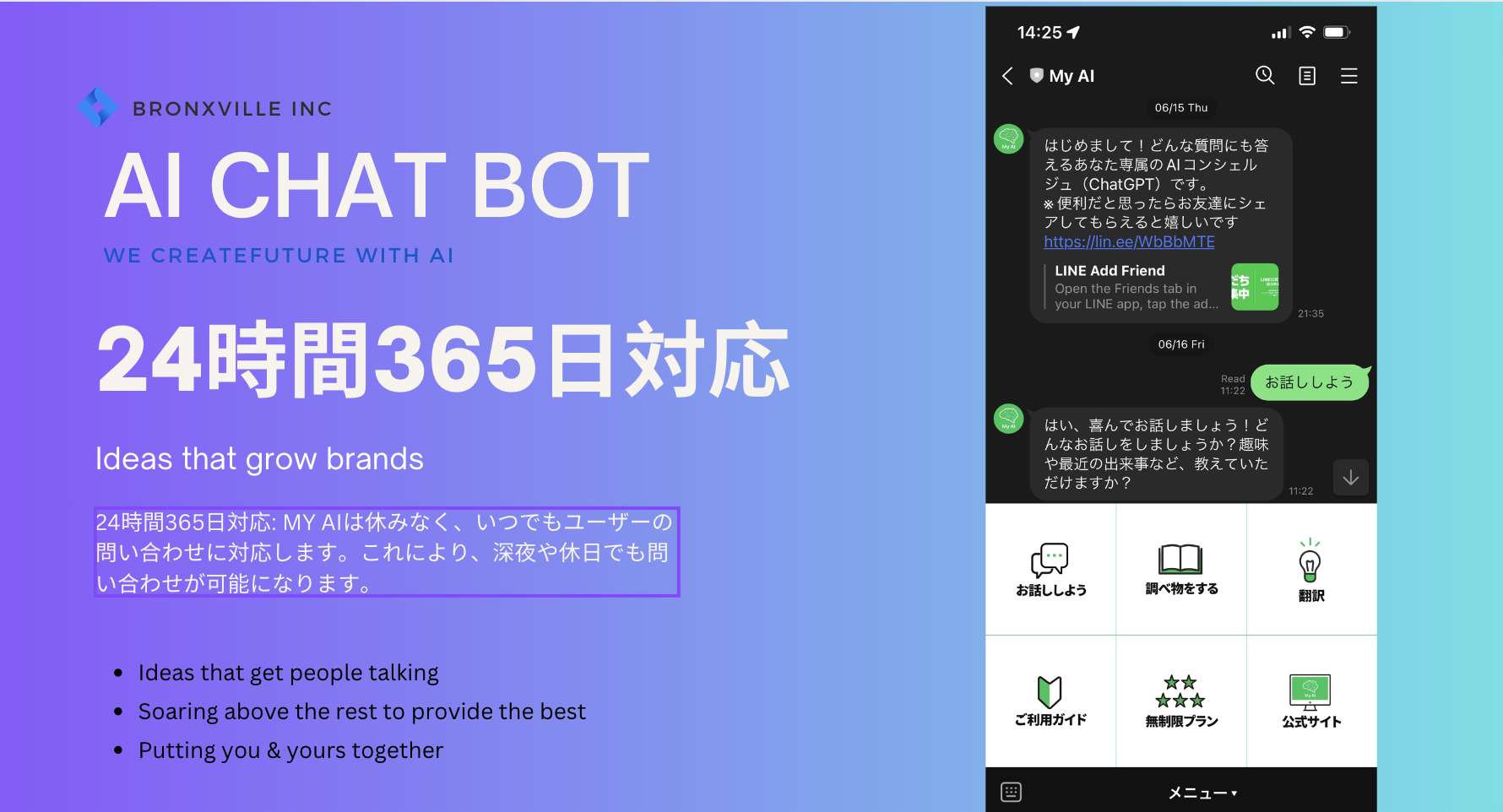My AI Lineチャットボットは、カスタマーサービスでは及ばないところへも手を伸ばし、皆様の問いに24時間対応します。