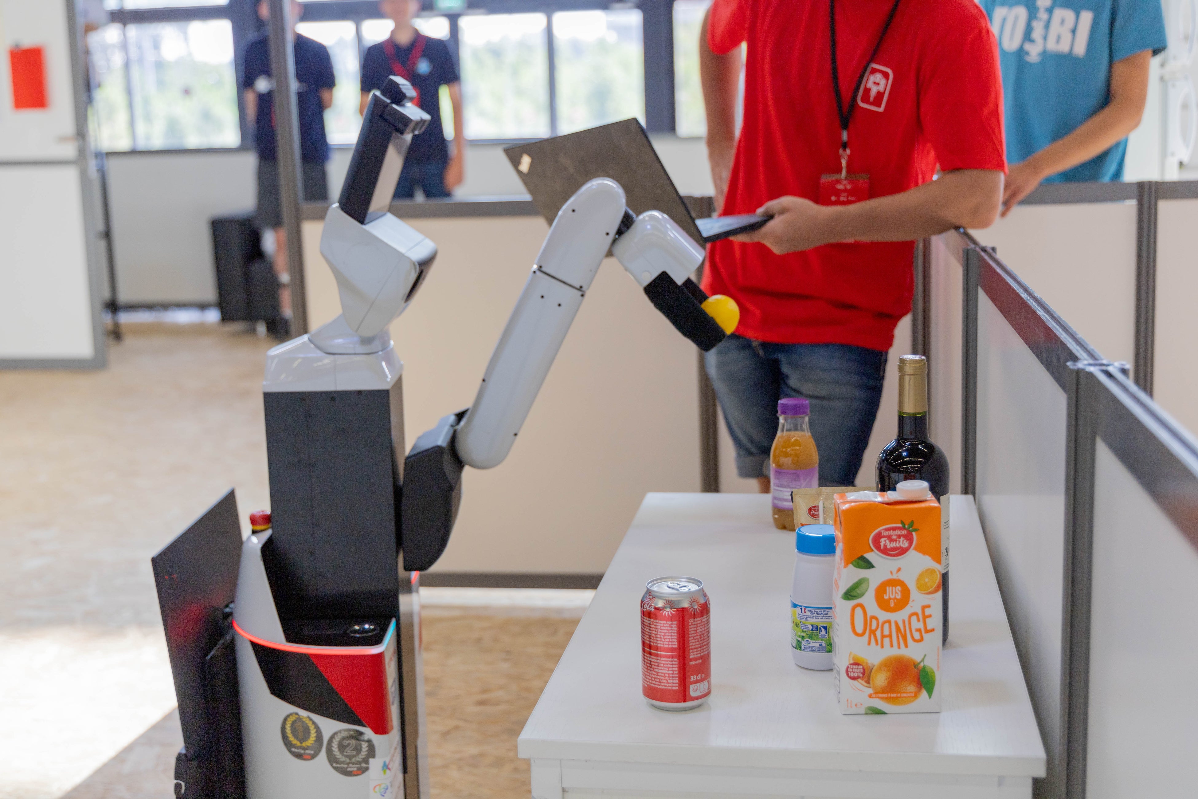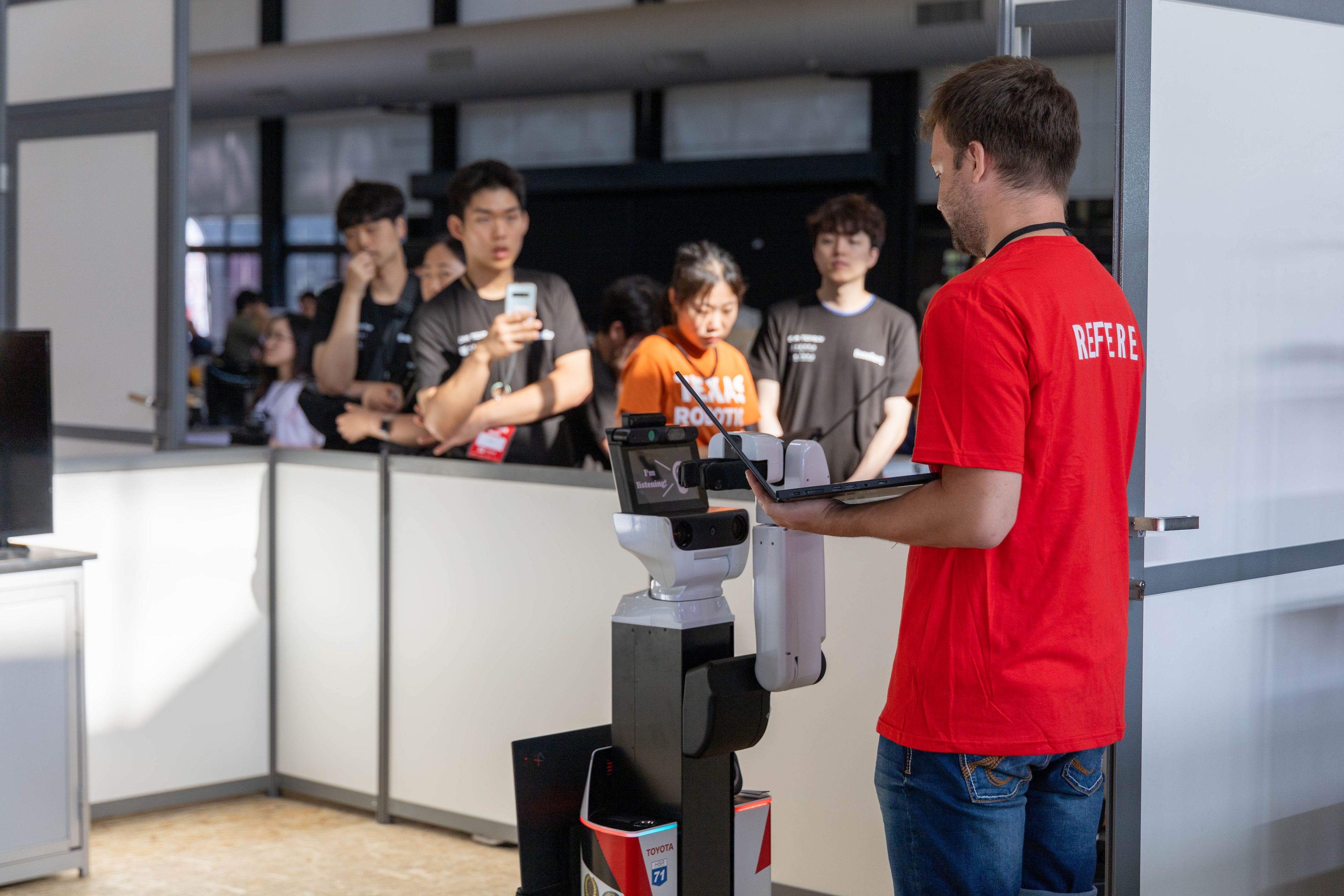 ロボカップは自律移動型ロボットによる競技会であり、@ホームリーグは、家庭やオフィスといった人間の生活空間で人間と協力して働くサービスロボットの性能を評価するリーグです。ロボットには、人間と自然な意思疎通を行い、周辺の環境を認識し、自ら行動を計画し実行するための高い人工知能の能力が求められます。
