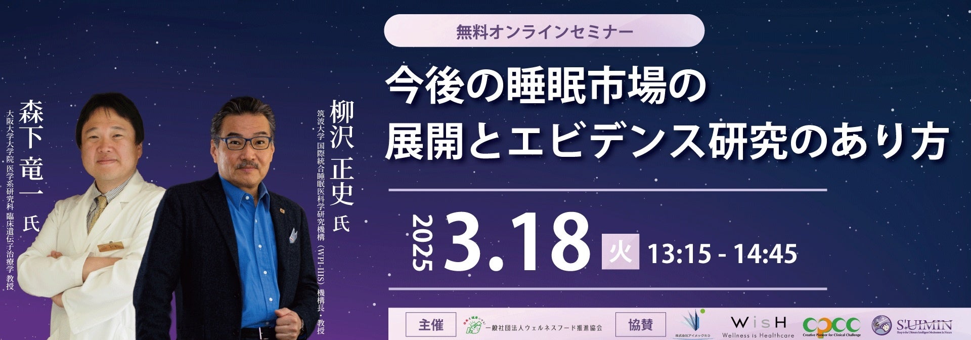 睡眠は健康・美容・パフォーマンス向上に直結する重要な要素であり、近年、睡眠関連市場は急速に拡大しています。従来の定性的な評価に加え、デバイスを活用することで睡眠の量や質を手軽に可視化できるようになり、科学的根拠に基づく商品・サービスの開発も加速しています。本セミナーでは、最新の睡眠研究の知見とエビデンスの活用について、第一線の専門家が解説します。