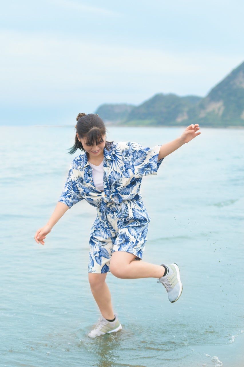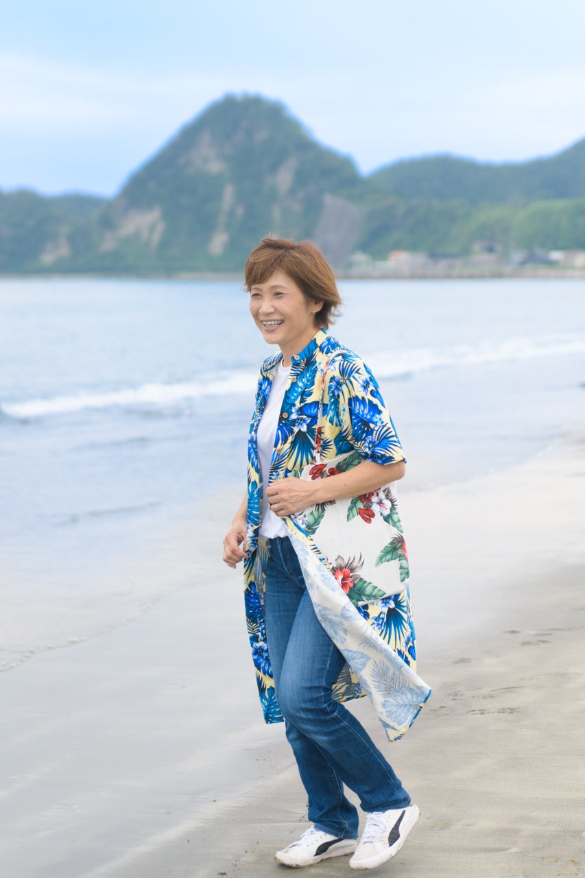 初めての商品は現在工場のある南房総市でも着られ、自社ブランドのコンセプト【時代に、年齢に、性別に左右されない、着る人が明るくなれる】をもとにリゾートウェアの開発に着手し、【南房総アロハシャツ】を製作いたしました。