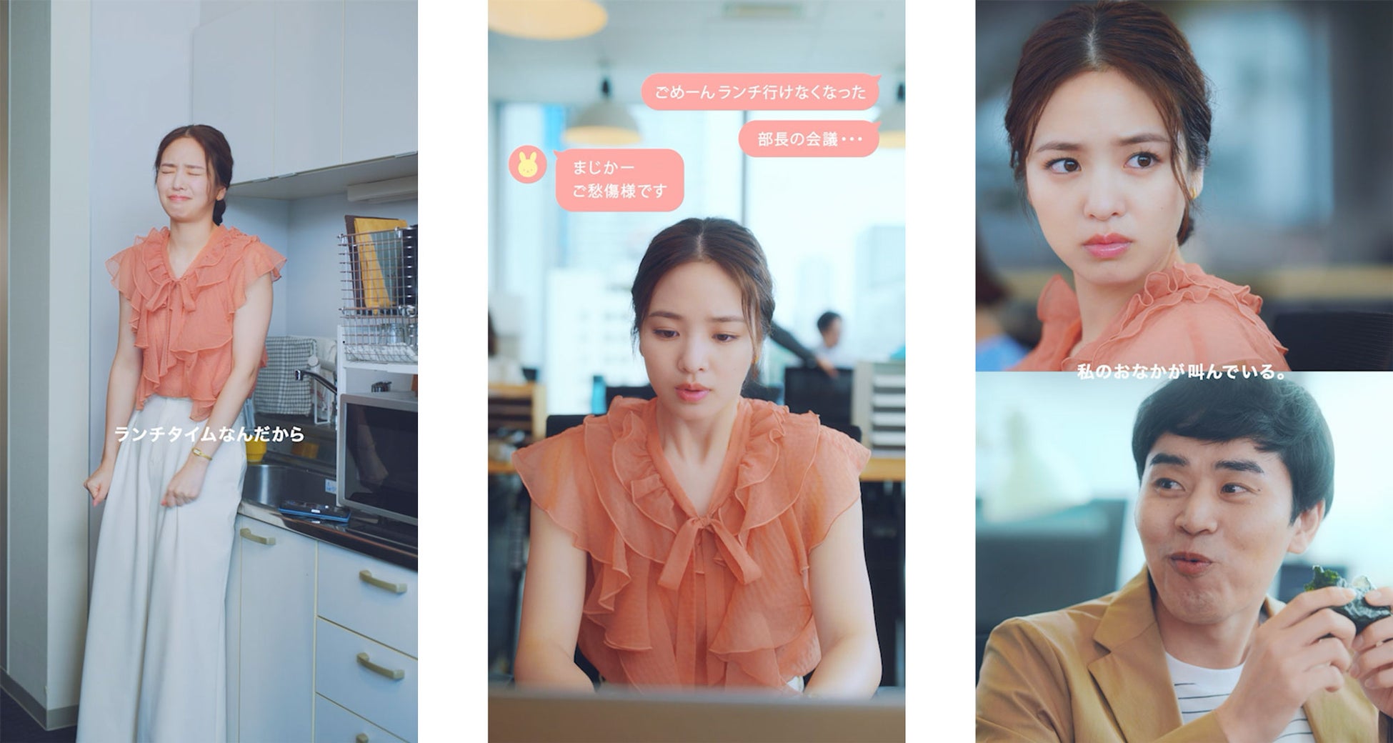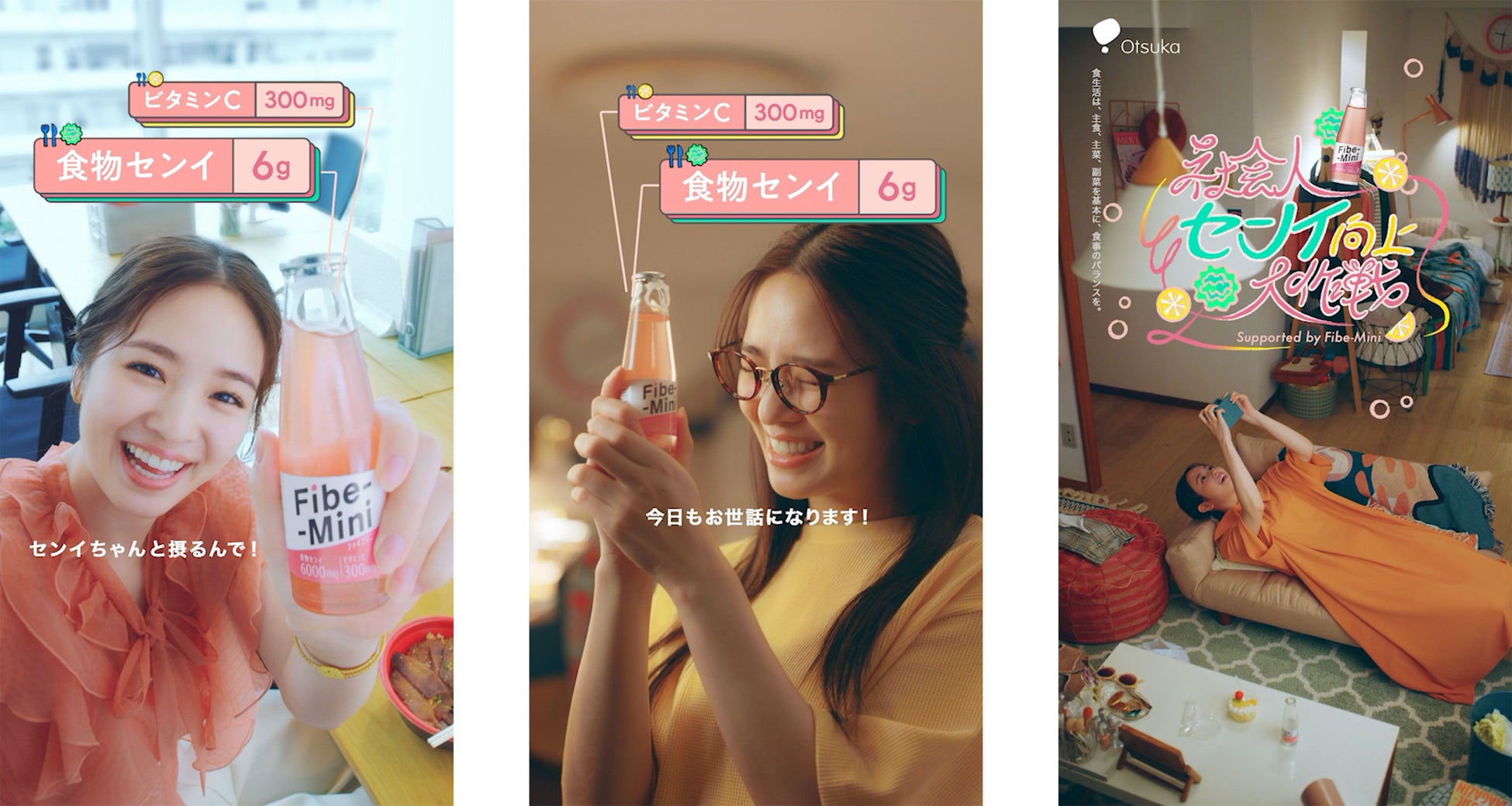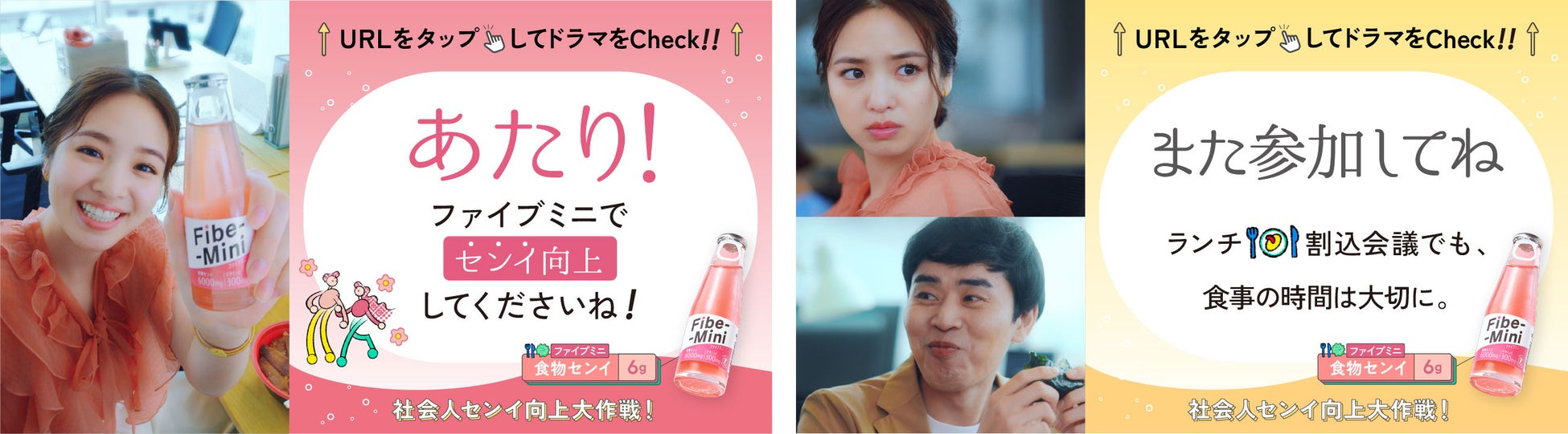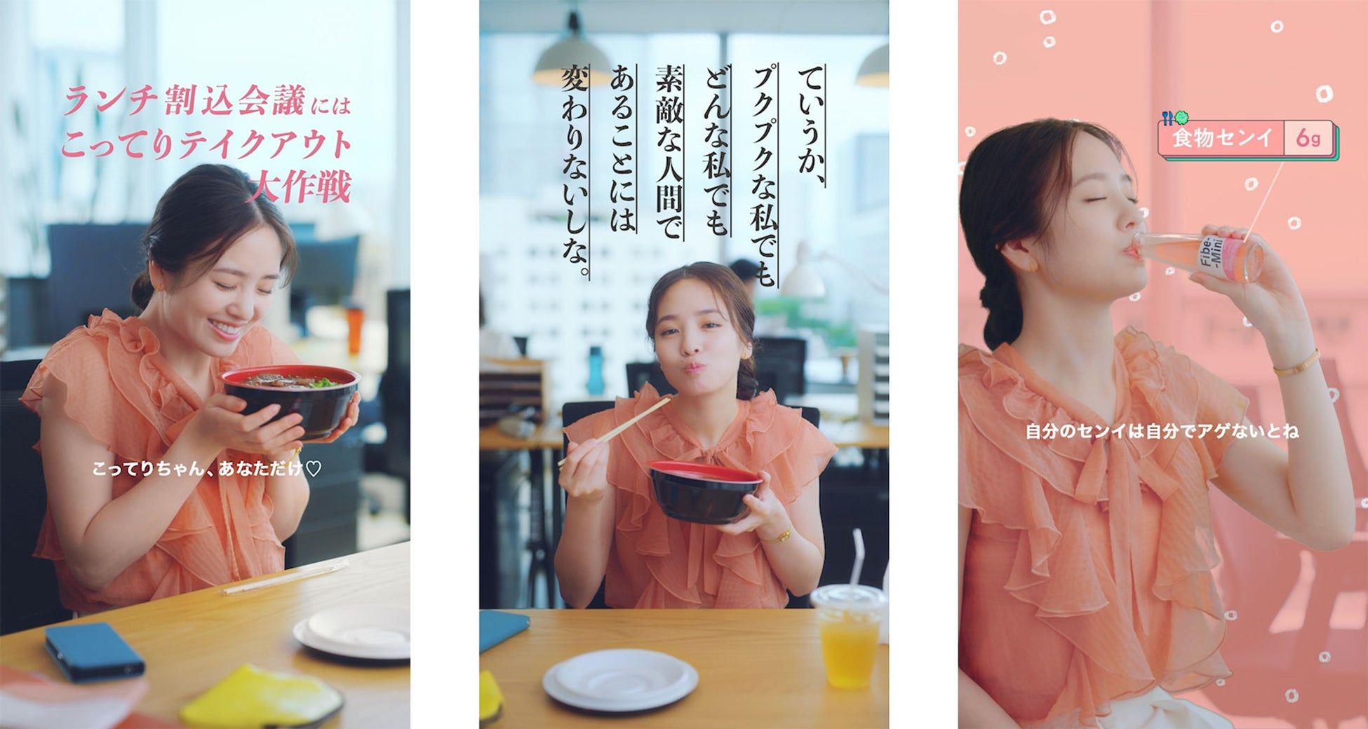 「社会人センイ向上大作戦」で横田真悠さんが演じるのは、「ランチに割り込んでくる会議」「テレワークで家にいながらの残業」「思いがけず発生する飲み会」など、自分ではどうしようもできない社会人あるあるに巻き込まれ「センイ喪失」する若手社会人の桃田あかり。ちゃんとした食事をしたい!と日々思いながらも、こうした「センイ喪失」タイミングでは思い通りの食事ができず、「食物センイ」も不足しがち。ドラマではそんな「センイ喪失」してしまうときに、ファイブミニで手軽に食物センイを補いながら、気分もスッキリと「センイ向上」する様子を描いています。