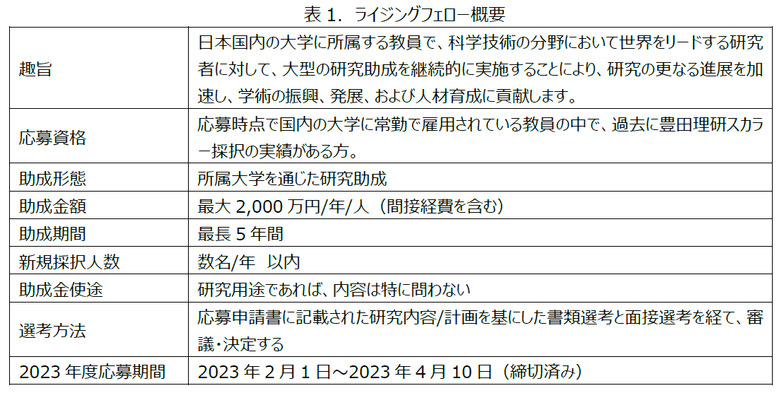 ライジングフェロー制度は、過去に豊田理研スカラー採択の実績がある者の中から、活発な研究活動を実施している新進気鋭の研究者が、将来、一流研究者として活躍することを期待して、5年間で最大1億円の大型の助成を行います。特長は、研究内容のみならず、先端研究分野を世界的に牽引していくことが期待される人物面も重視して選考する点です。選考においてはダイバーシティも考慮します。