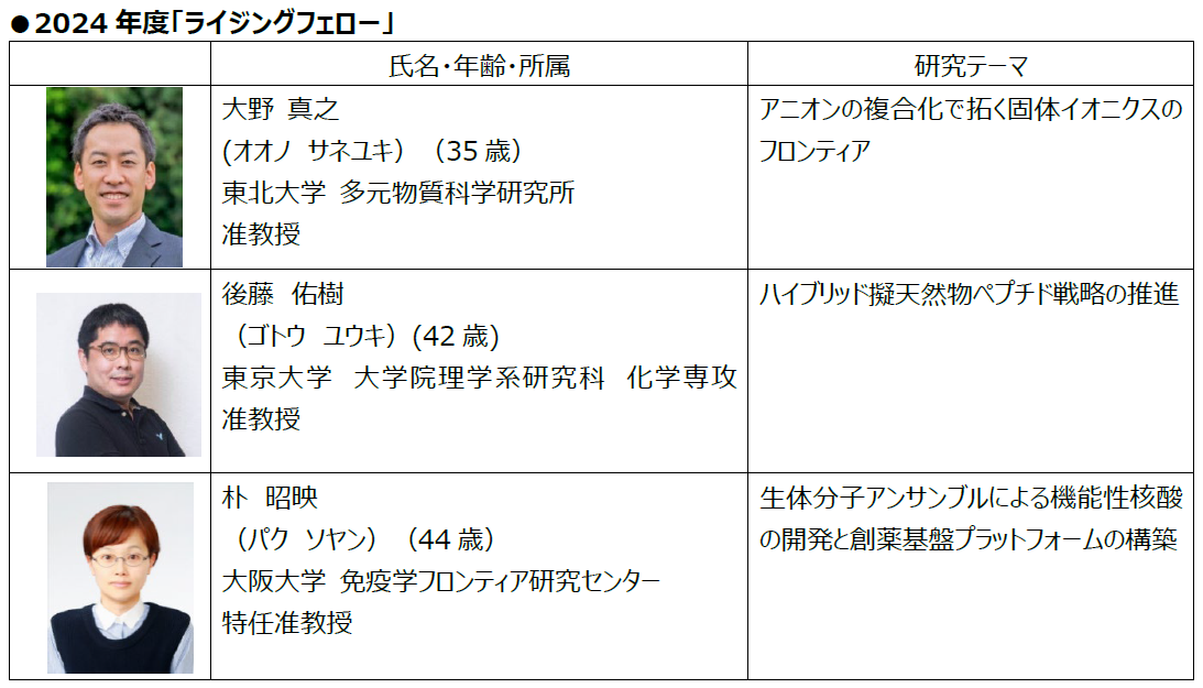 将来が期待される若手研究者に最大5年間で1億円の研究費を助成初年度の「ライジングフェロー」助成研究者3名が決定