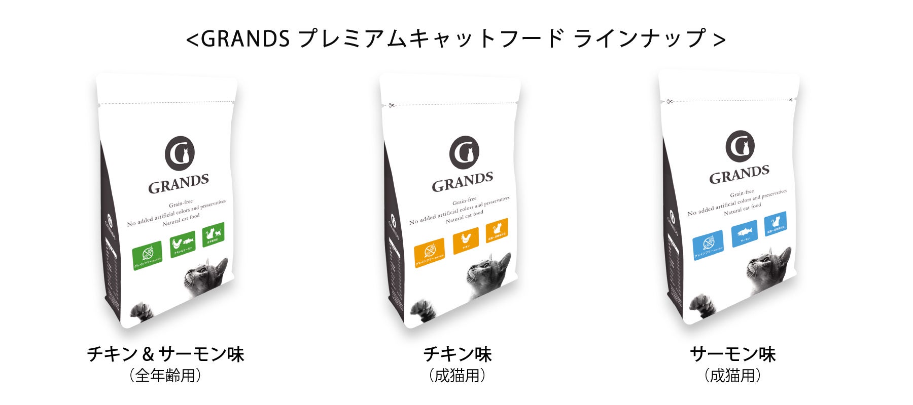 1.GRANDSプレミアムキャットフード500gを3味(チキン&サーモン・チキン・サーモン)各1袋(計1.5kg)