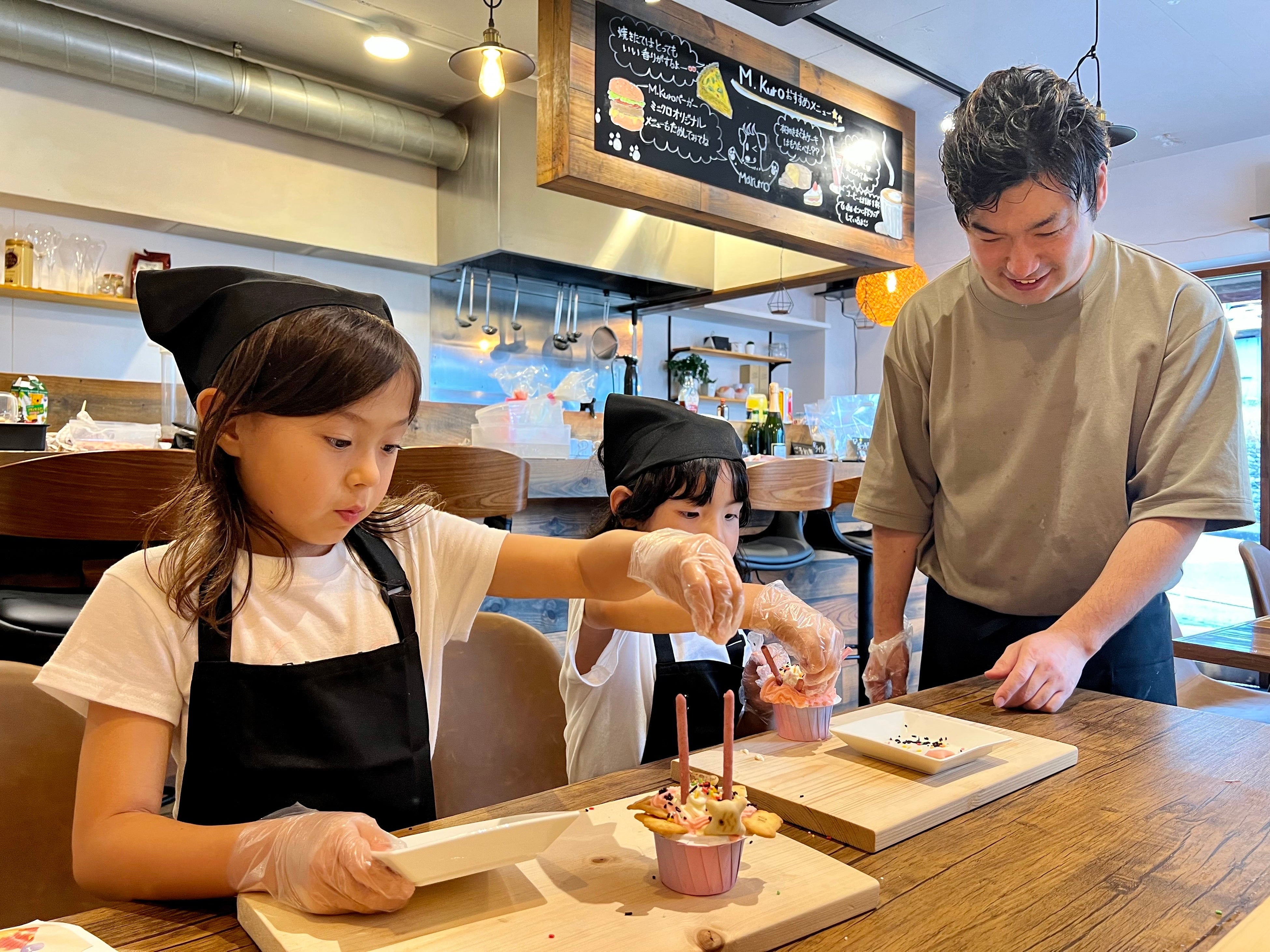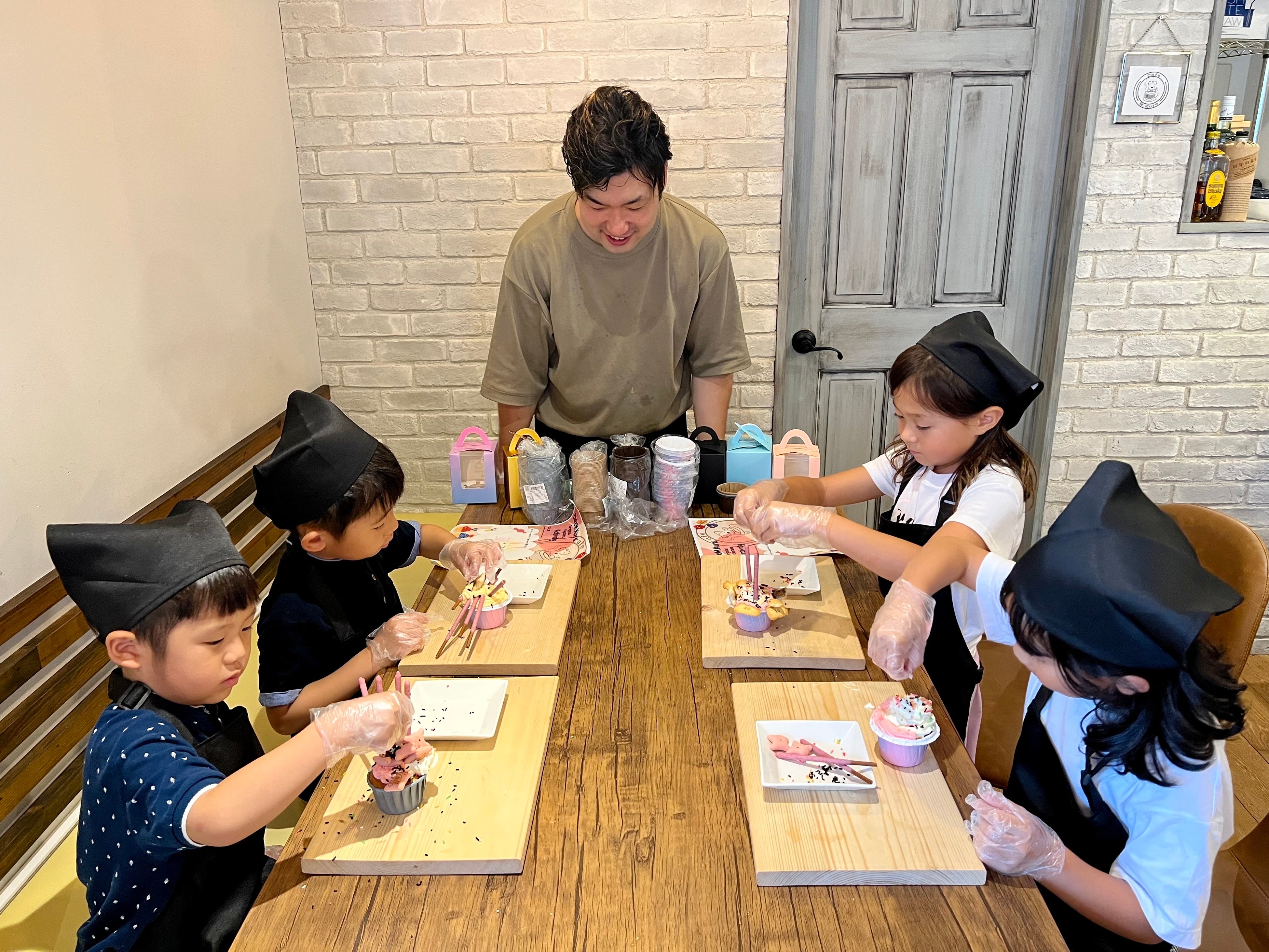 Cafe M.Kuro(カフェ)による「商品開発!自分だけのカップケーキを作ろう!」の体験イメージです。子どもたちは終始楽しそうに、時には真剣な表情も見せながら、生き生きと仕事に取り組んでくれました。