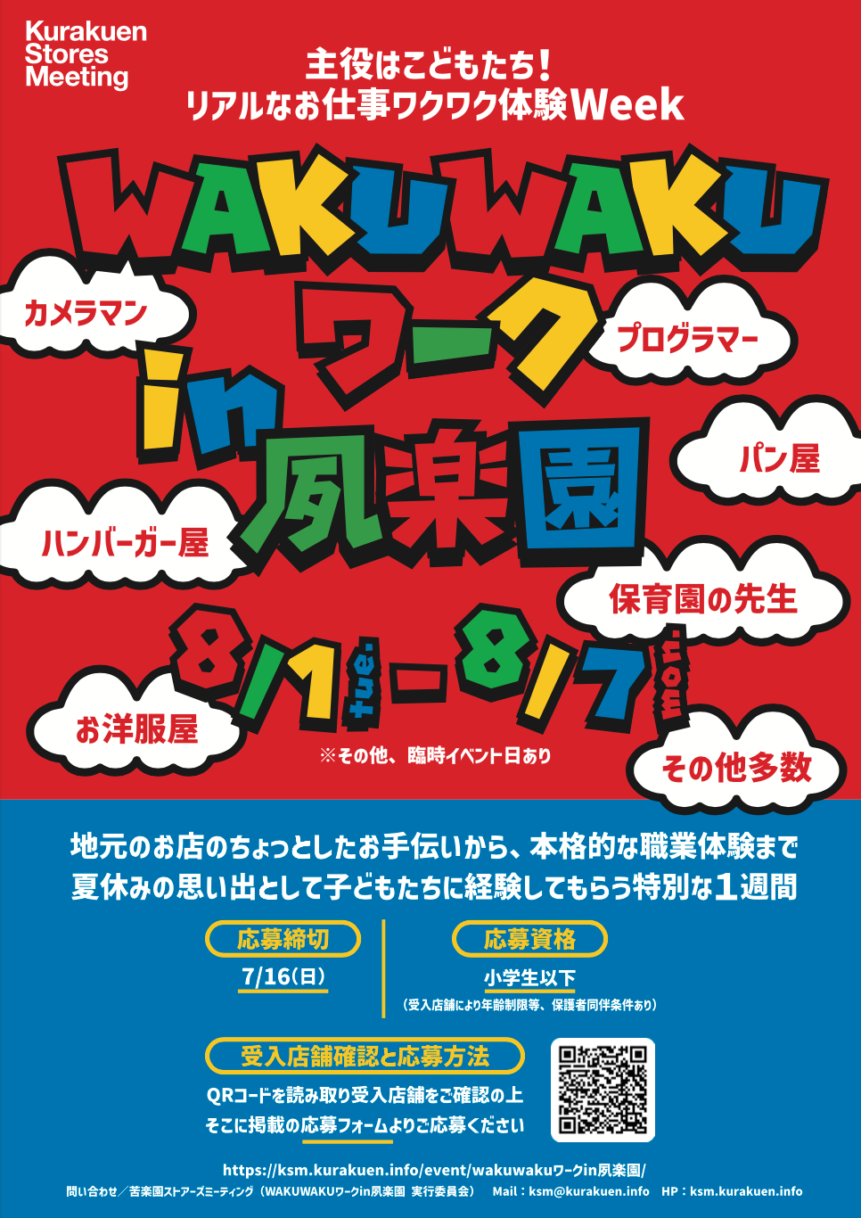 苦楽園ストアーズミーティングは2023年8月1日(火) 〜 8月7日(月)の期間で「WAKUWAKUワークin夙楽園」~ 主役はこどもたち!リアルなお仕事ワクワク体験WEEK~を開催します。