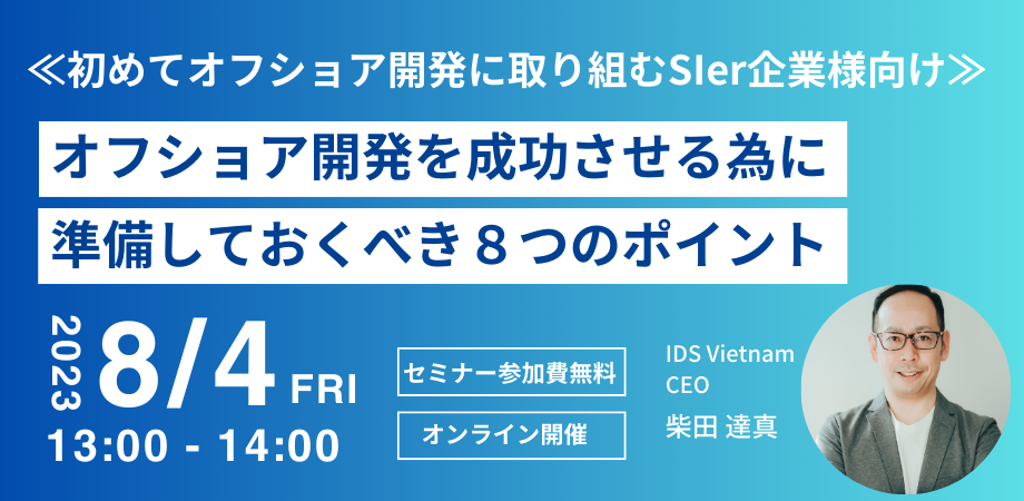 初めてオフショア開発に取り組むSIer企業様向けセミナー『オフショア開発を成功させる為に準備しておくべき8つのポイント』を8月4日(金)に開催いたします
