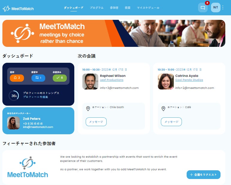 何百ものパブリッシャー、投資家、政府、開発者に信頼されているこのプレミアムB2Bイベントネットワーキングプラットフォームは、偶然ではなく、選択によって潜在的なビジネスパートナーと出会うことを目的としています。『MeetToMatch』のサービスを利用すれば、他の参加者のミーティング、セッション、製品、サービスとの接続、計画、探索が可能になります。