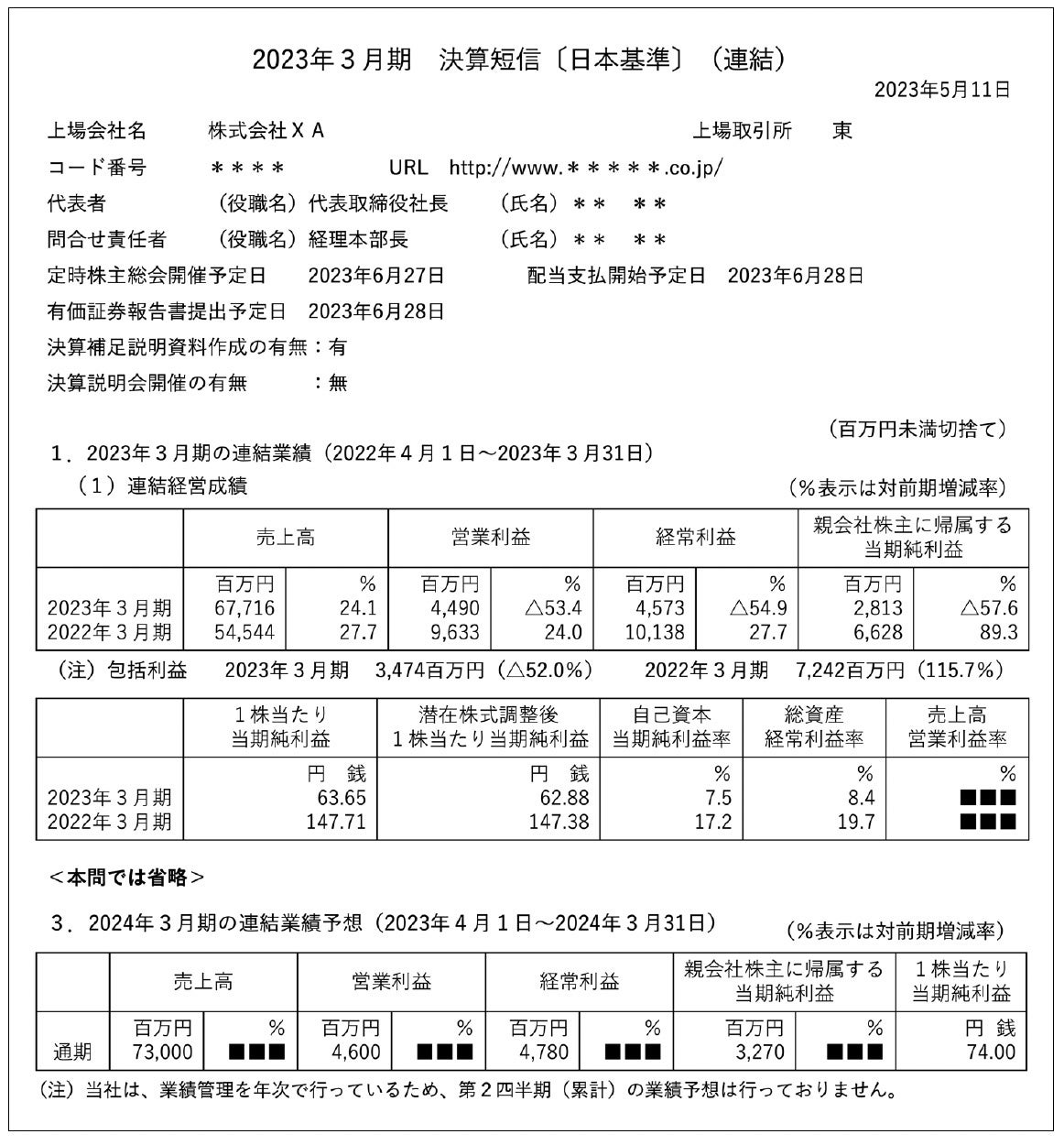 次の資料は、株式会社XA(株価1,890 円)の決算短信の一部を抜粋したものです。この資料に関する