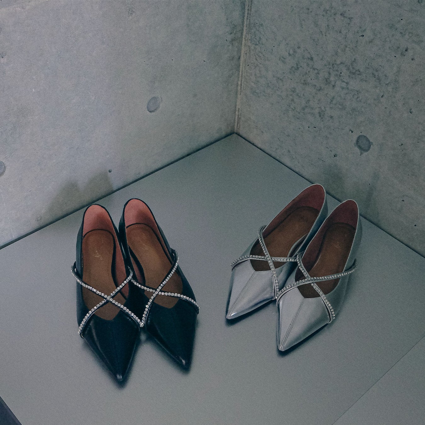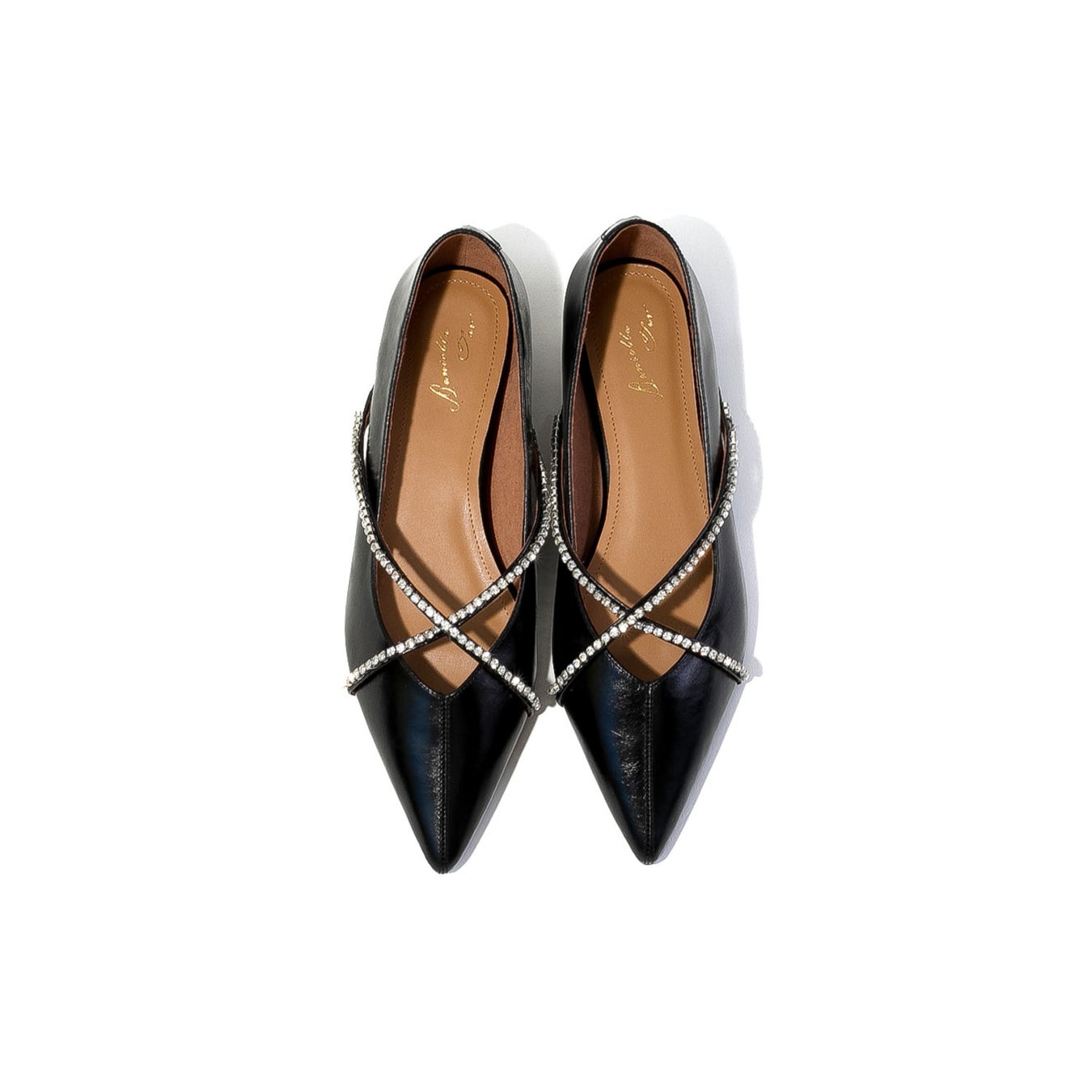 大胆にクロスしたビジューのラインが印象的なフラットパンプス