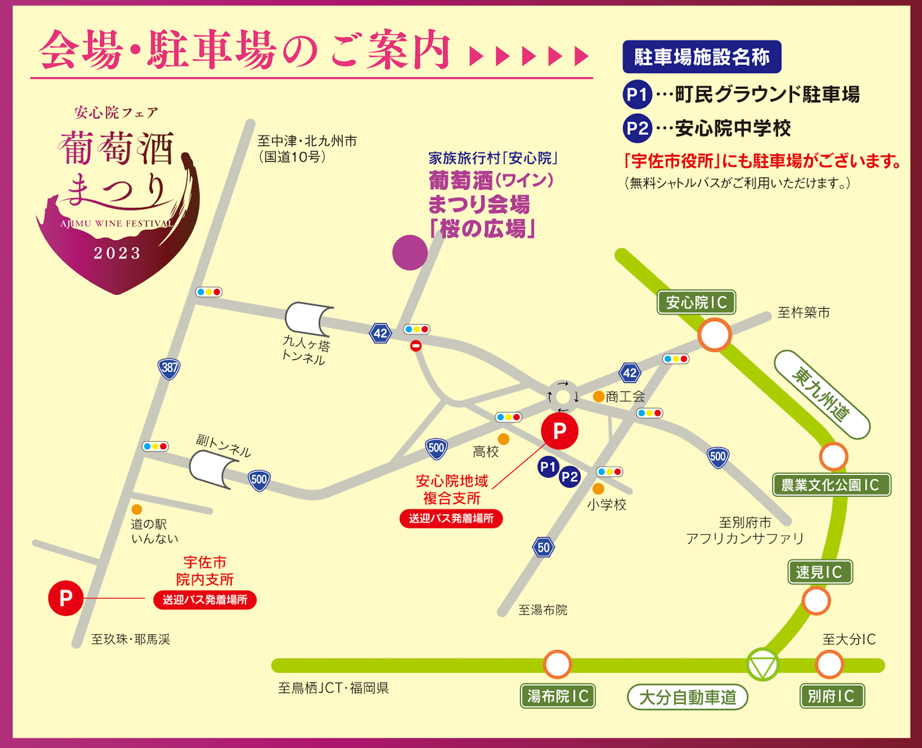 ※「安心院地域複合支所」・「院内支所」から会場行きのピストンバスが随時運行しています