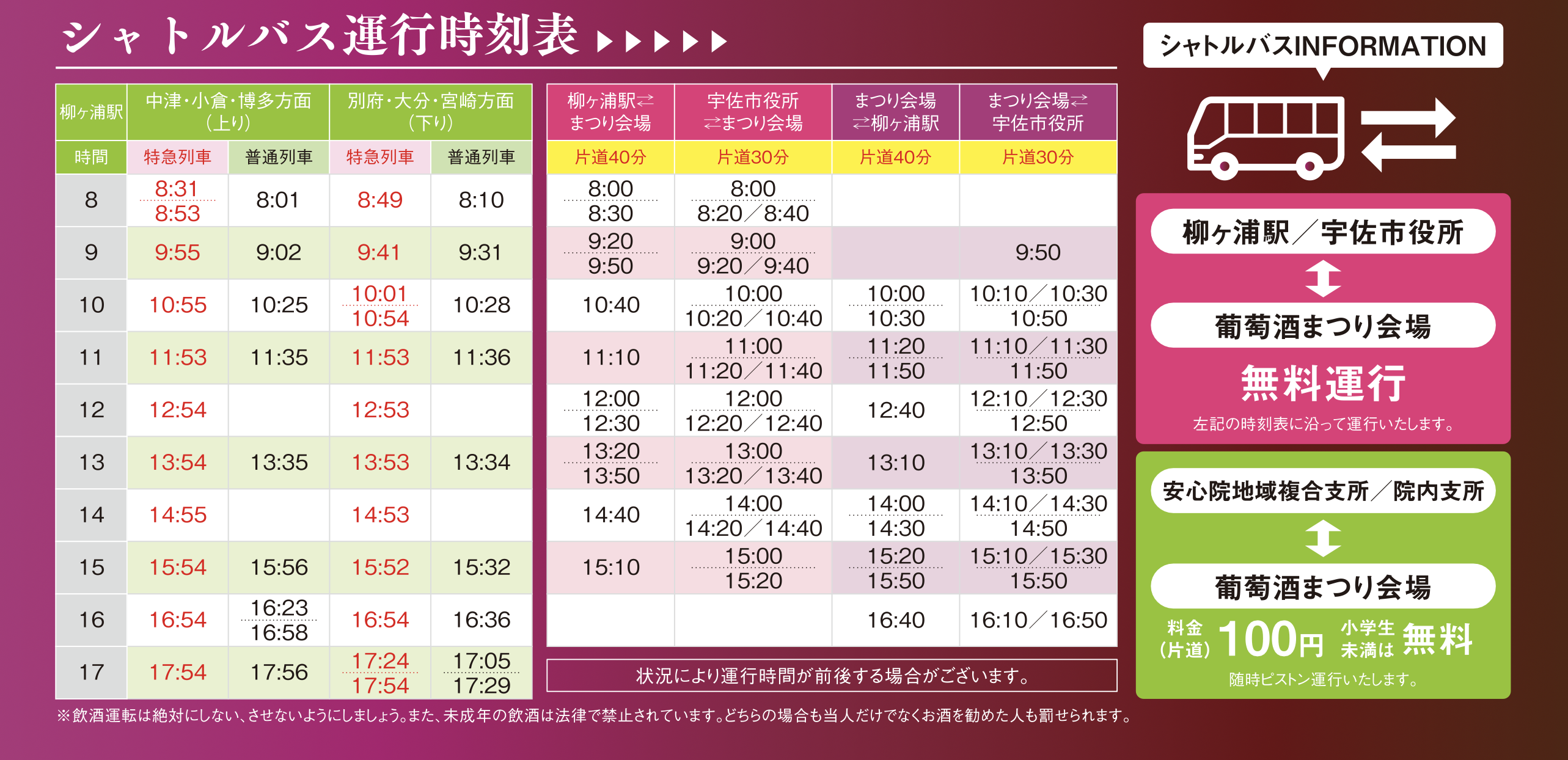 ★「JR柳ヶ浦駅」・「宇佐市役所(駐車場利用可)」からは無料シャトルバスが運行しています