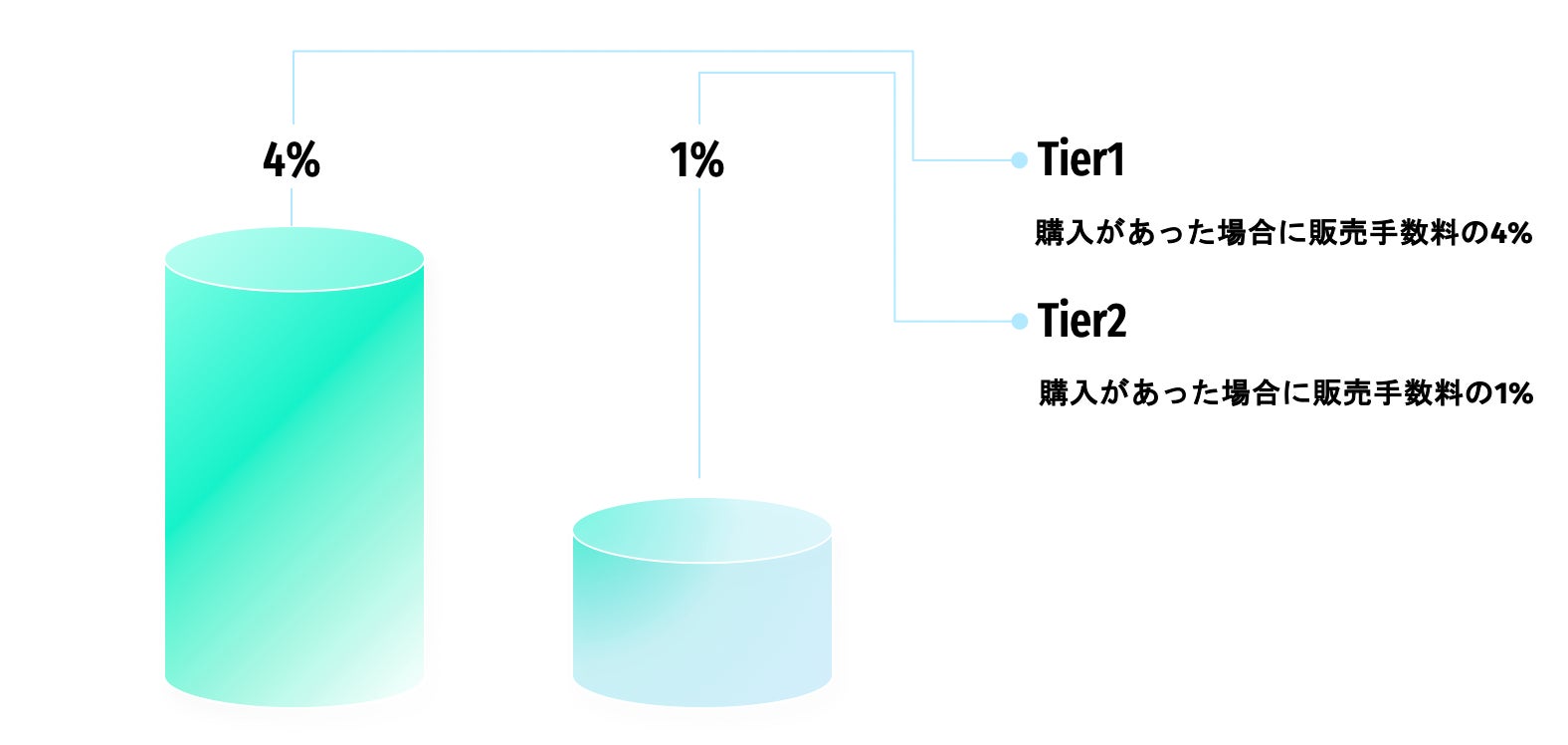 紹介者(A)に招待されサイトに登録したユーザー(B)が商品を購入した場合、購入金額の4%の報酬が発生。紹介者(A)に招待されサイトに登録したユーザー(B)が、別のユーザー(C)を招待した場合に、(C)の購入金額に対して(A)も1%の報酬を得ることができます。