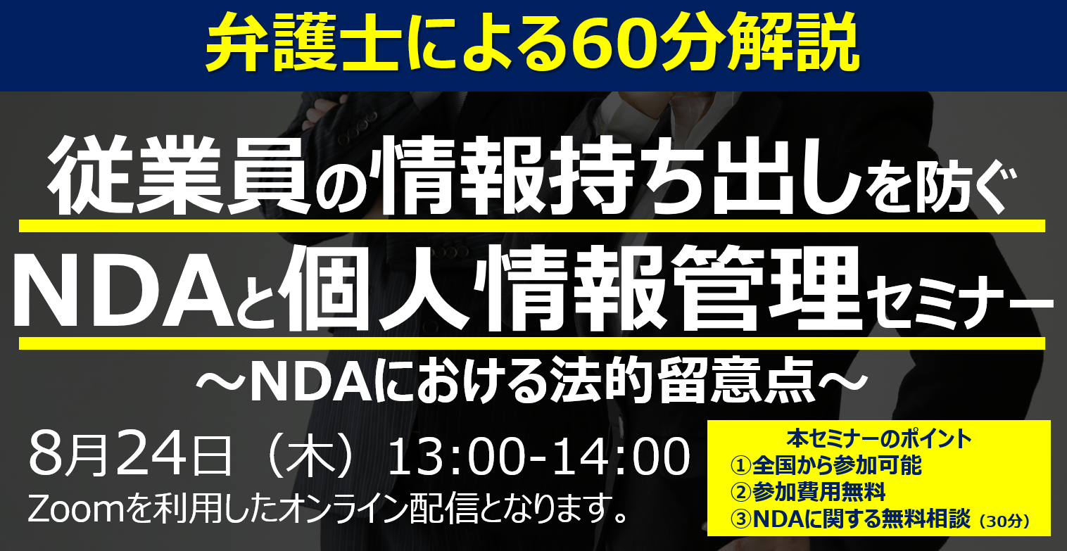 「従業員の情報持ち出しを防ぐNDAと個人情報管理セミナー」を8月24日(木)無料・オンラインにて開催いたします