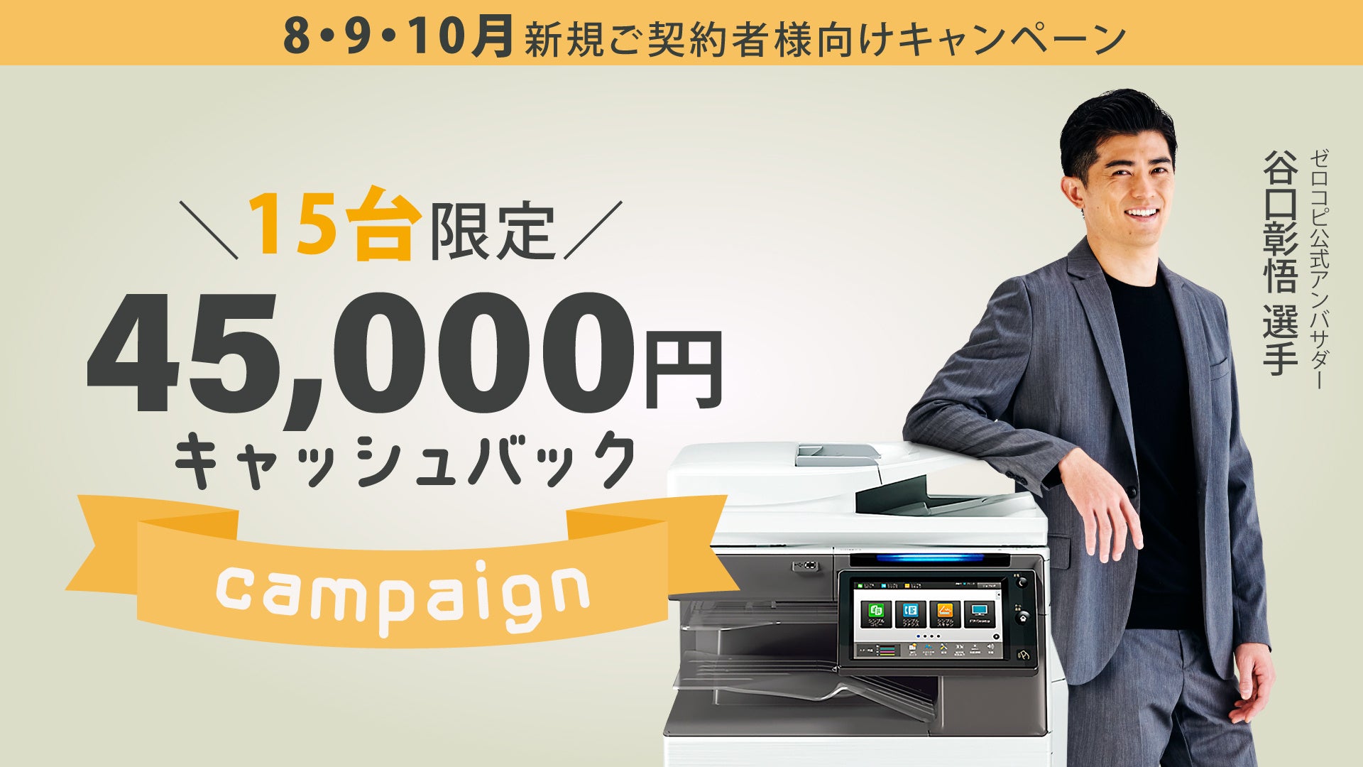 大型コピー機レンタル『ZEROコピ』の搬入設置費用(45,000円)全額分のキャッシュバックキャンペーンとなります。