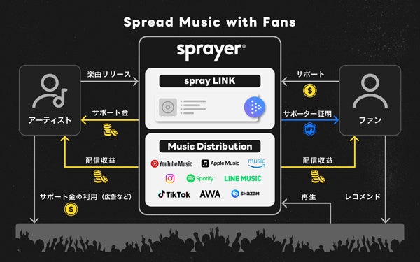「Spread Music with Fans」(ファンと共に音楽を拡げる)を掲げる「sprayer(R)」では、オリジナル楽曲を登録するだけで誰でも世界中のストアで配信及び収益化できます。さらに独自の作品ページ『spray LINK』によって新しい方法でファンに音楽を届けることができます。