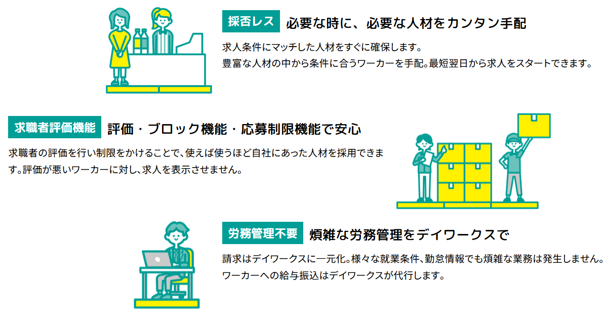 当日の求人募集も可能なため、急な欠員や人手不足の際にも活用できます。