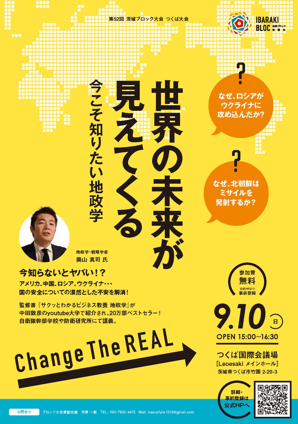 9/10 世界の未来が見えてくる~今こそ知りたい地政学~ 講師 奥山 真司 開会15時~16時半終了予定 会場:つくば国際会議場メインホール1F(参加無料)