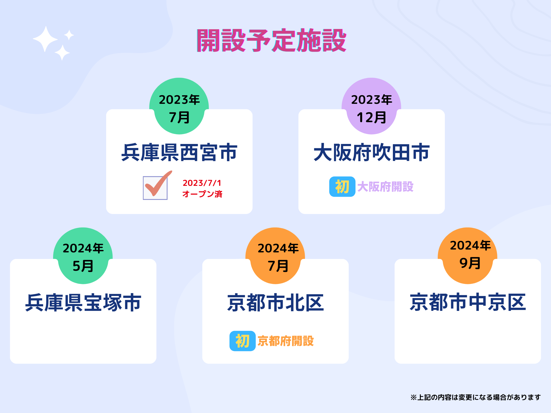 当社は、今まで中四国・九州地方を中心とした西日本の都市の中心部に開設を進めてまいりましたが、上記施設である34施設目の開設を機に、需要の見込める関西圏の中心部に積極的な施設展開を進めていきます。