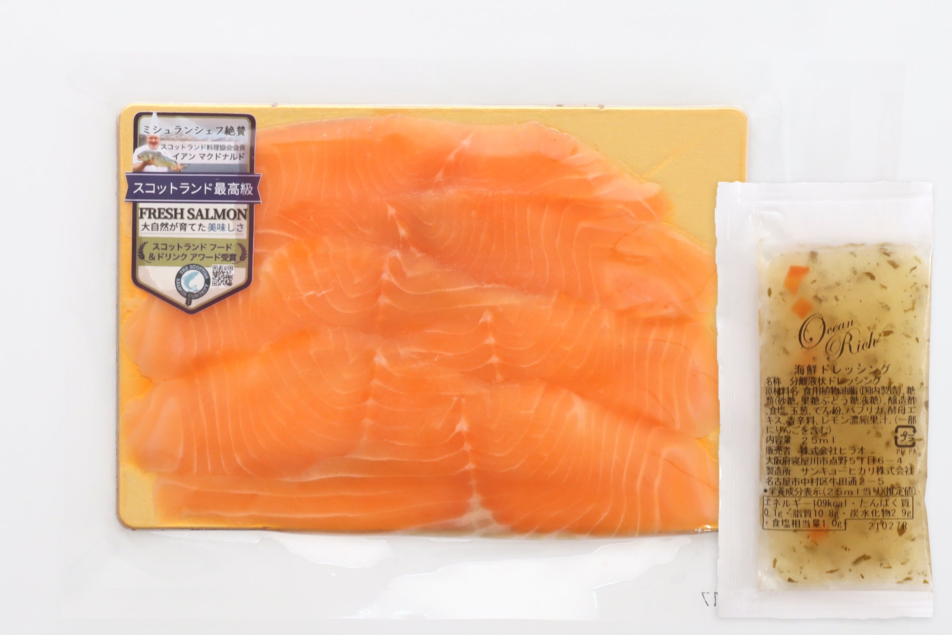 税込み5,000円以上のお買い上げで、「スコティッシュスモークサーモン(60g)+ドレッシング(1個)」をプレゼントします。プレゼントはご購入いただいた際の「お届け先」に同梱します。