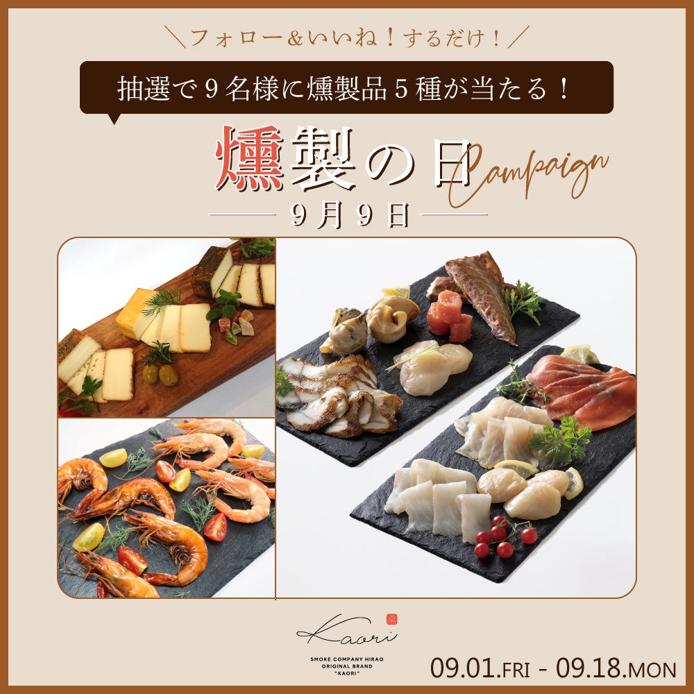 「日本の食文化・燻製の日」を記念して、2023年9月1日から9月18日まで、自社ブランドKaori-熏のInstagramで「フォロー&いいね」キャンペーンを実施します。