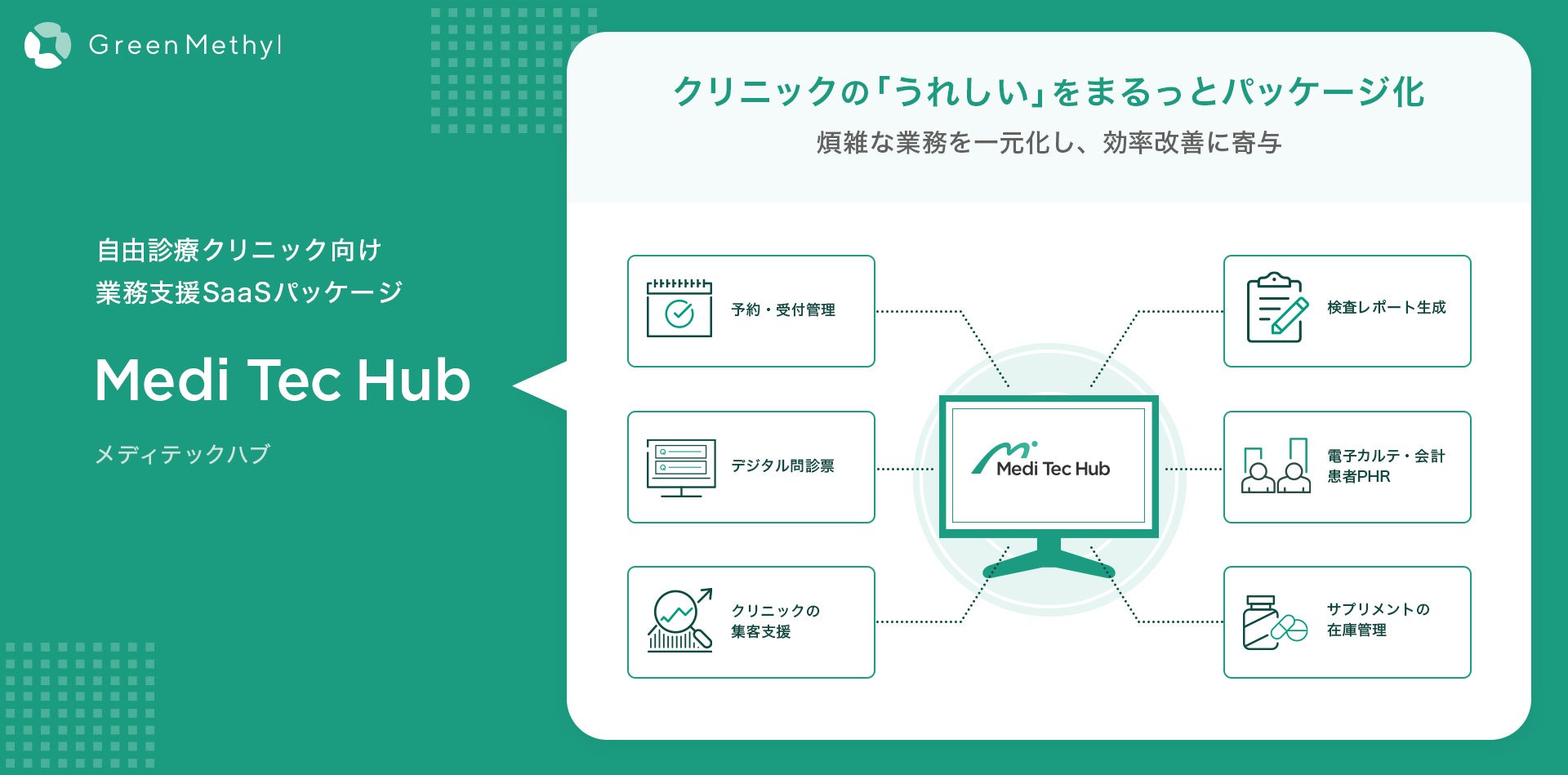 『メディテックハブ』は、自由診療クリニック向けの業務支援Saasパッケージです。