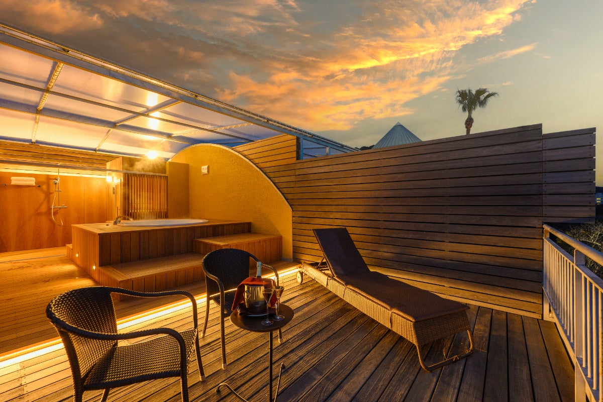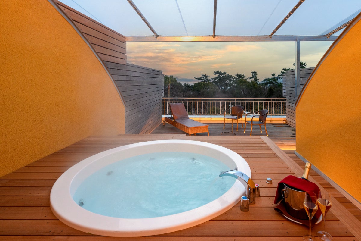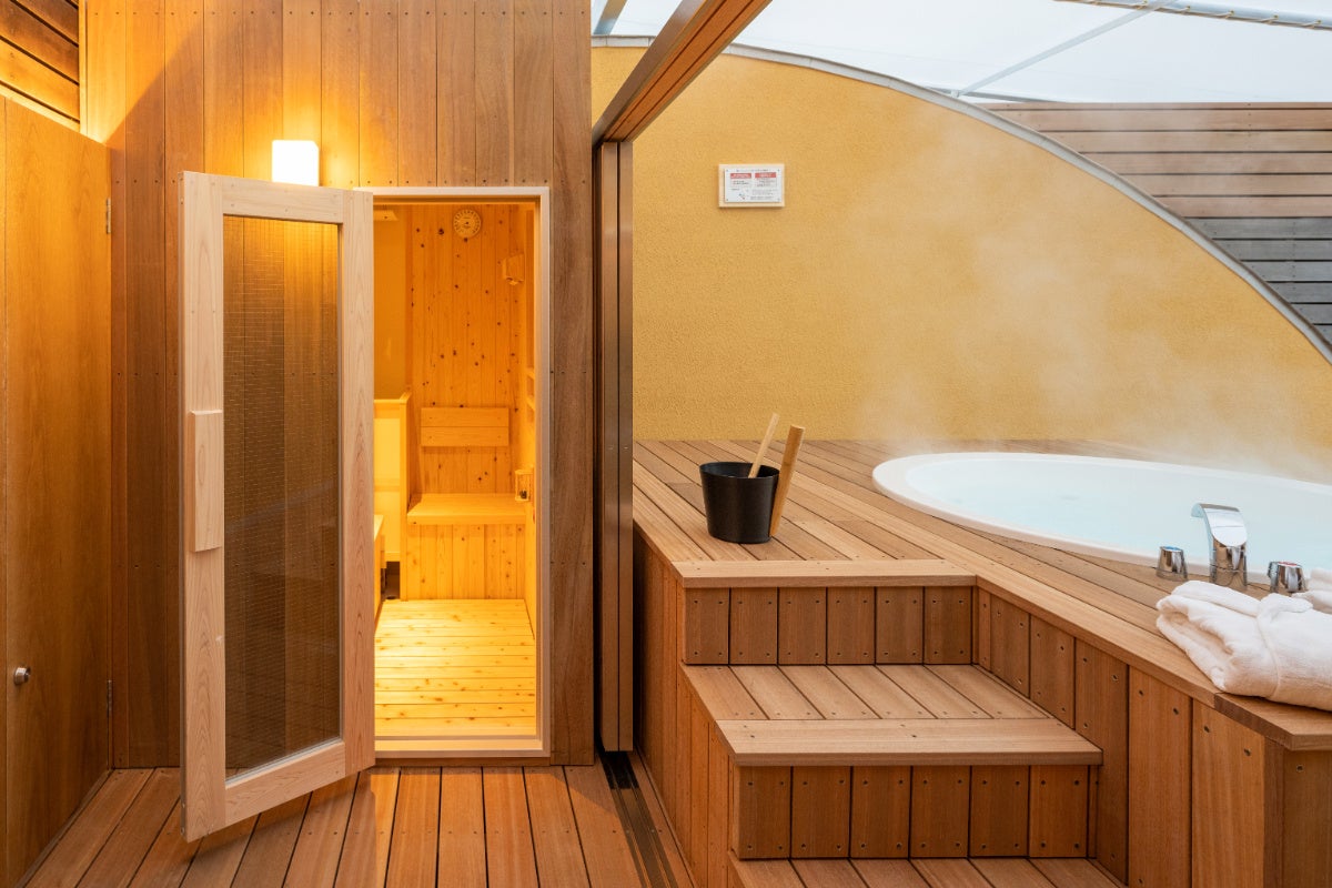 特徴としては3階建てメゾネット客室の3階屋上部分に、客室専用ジェットバス付き露天風呂とロウリュ式プライベートサウナルームを設け、人目を気にせず滞在中は何度でも露天風呂とサウナが楽しめる仕様となっており、
