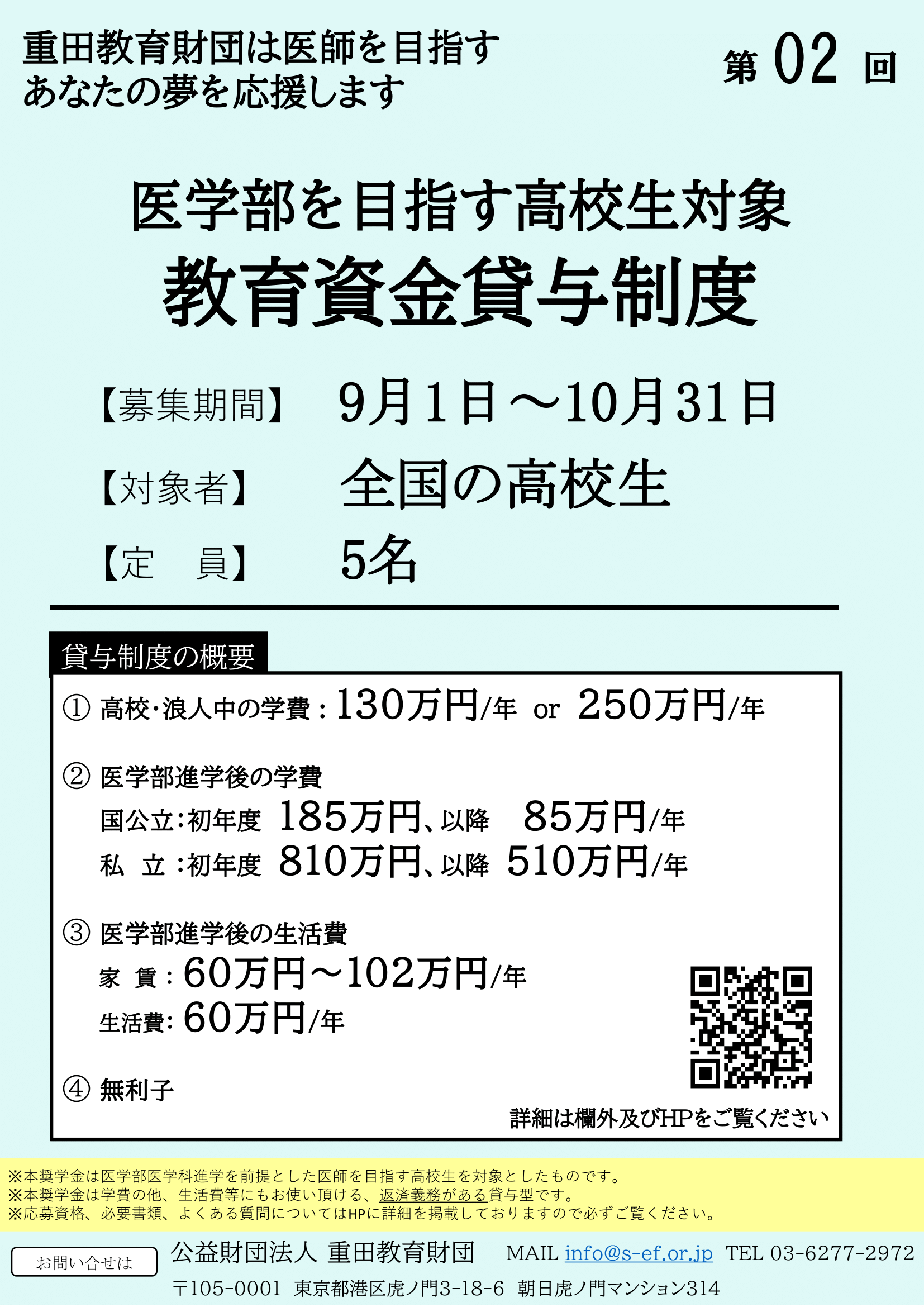 全国5名定員で医師を目指す日本人高校生へ教育資金の貸与を行います。